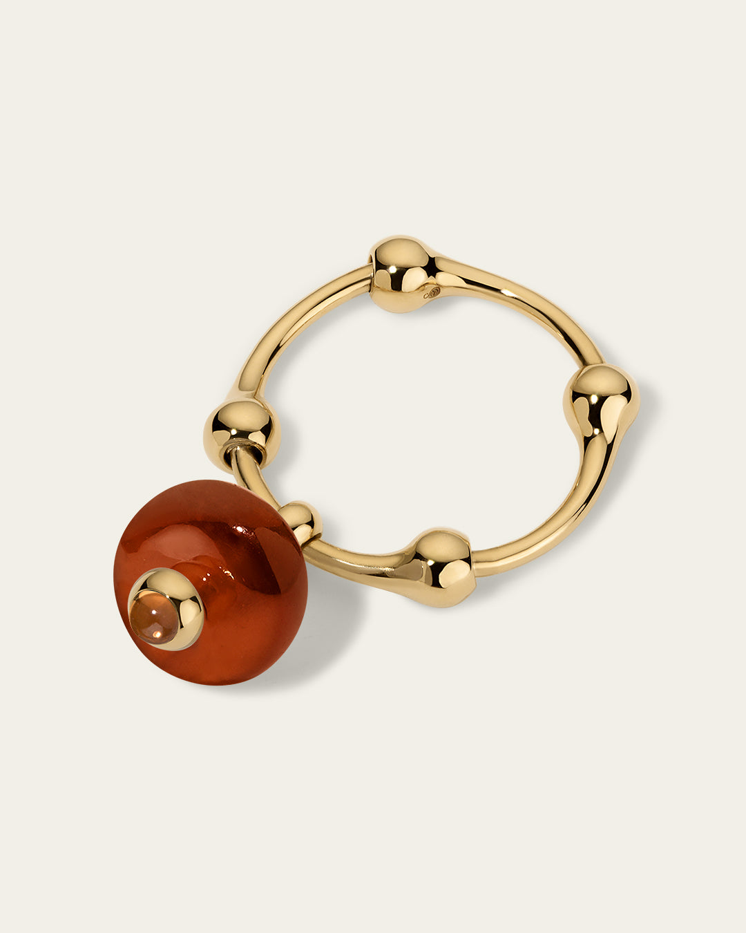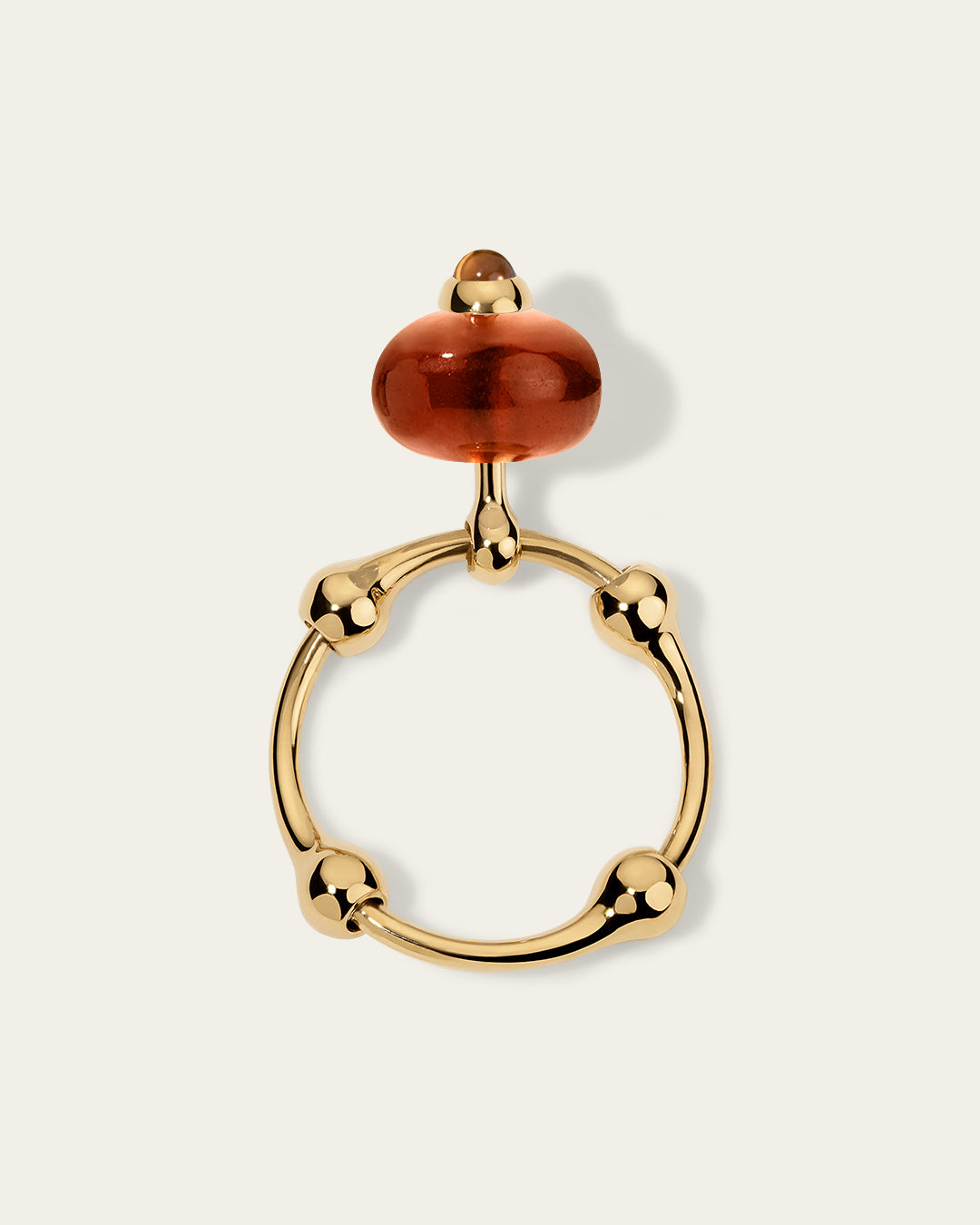 18K gold Signature SES chain ring with a proprietary linking system, featuring a sliding hessonite garnet bead drop accented by a 3 mm orange sapphire cabochon.