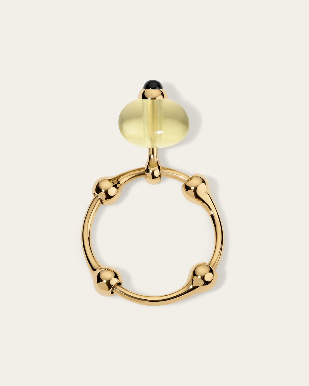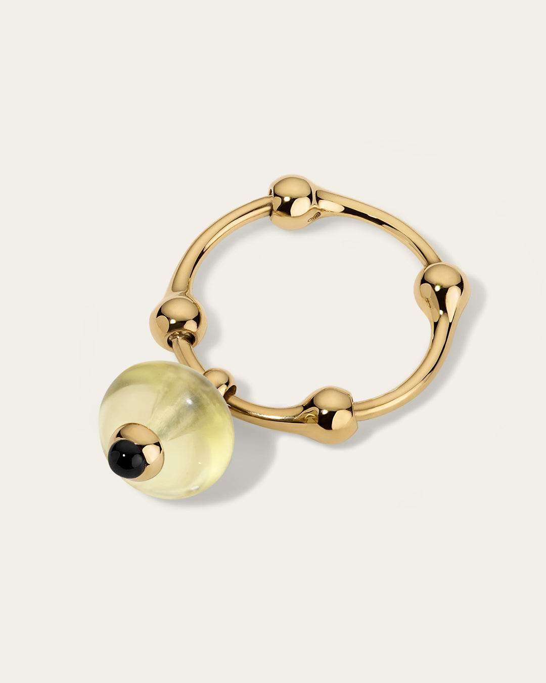 18K gold Signature SES chain ring with a proprietary linking system, featuring a drop with a sliding lemon quartz bead and a 3 mm black spinel cabochon accent.