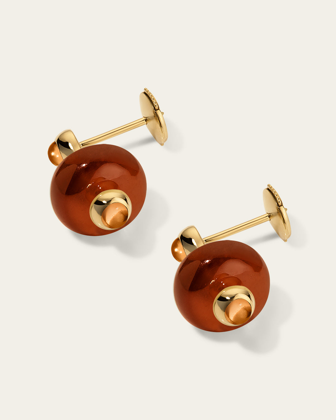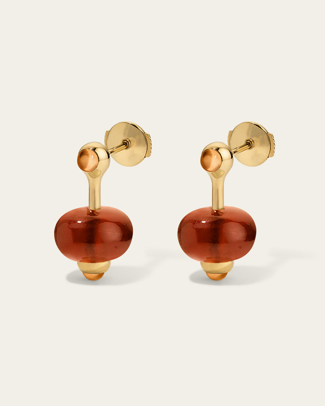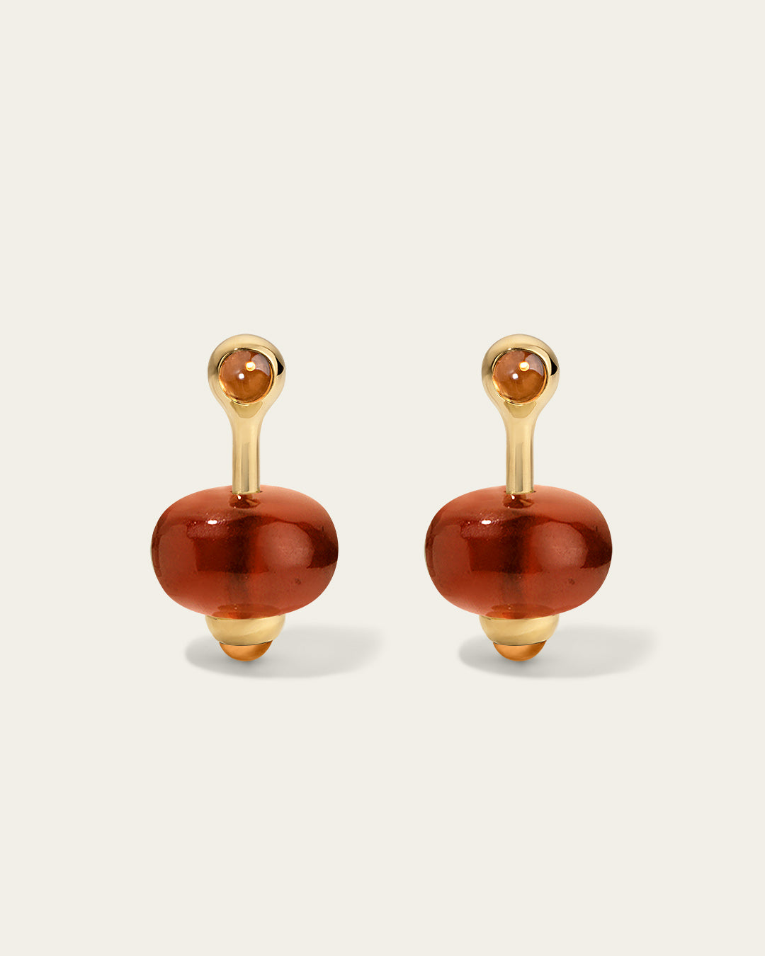18K gold drop earrings featuring a sliding hessonite garnet bead and 3 mm orange sapphire cabochons at each end.