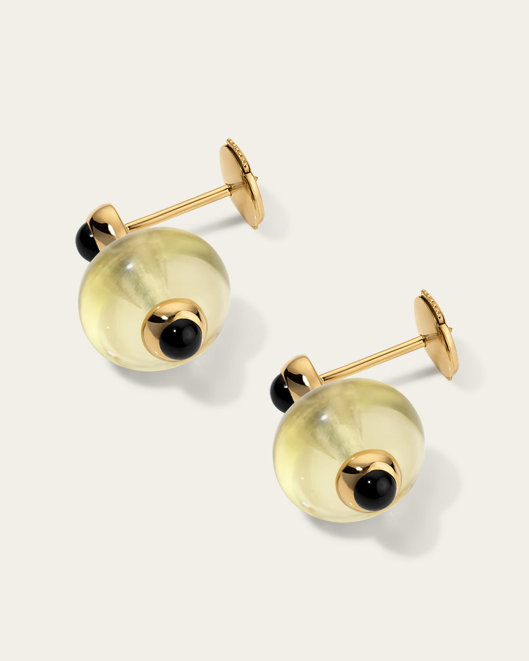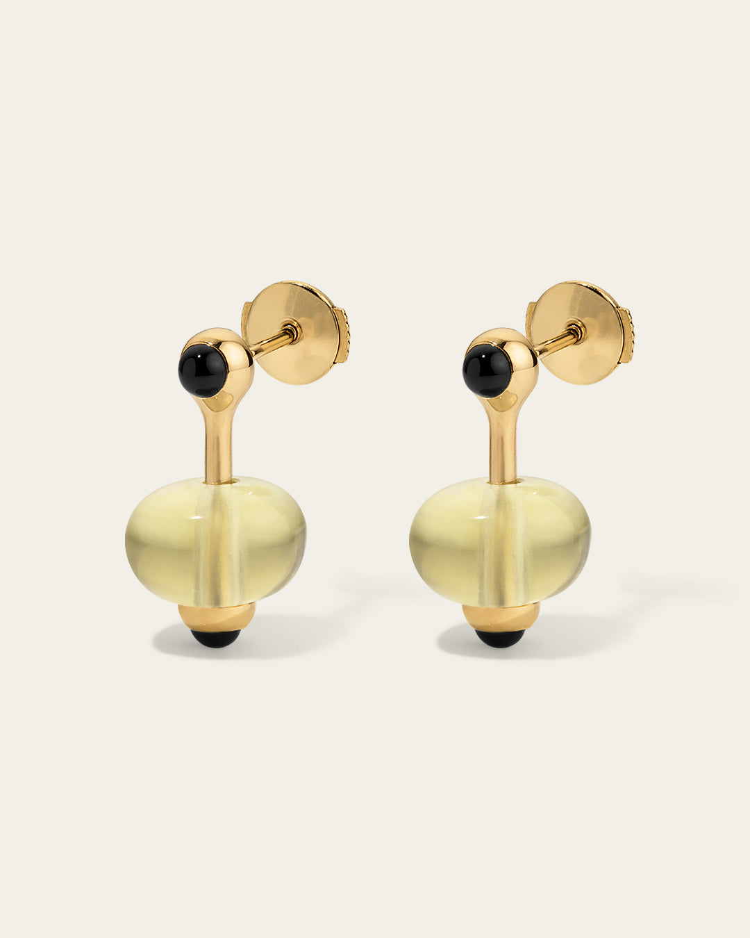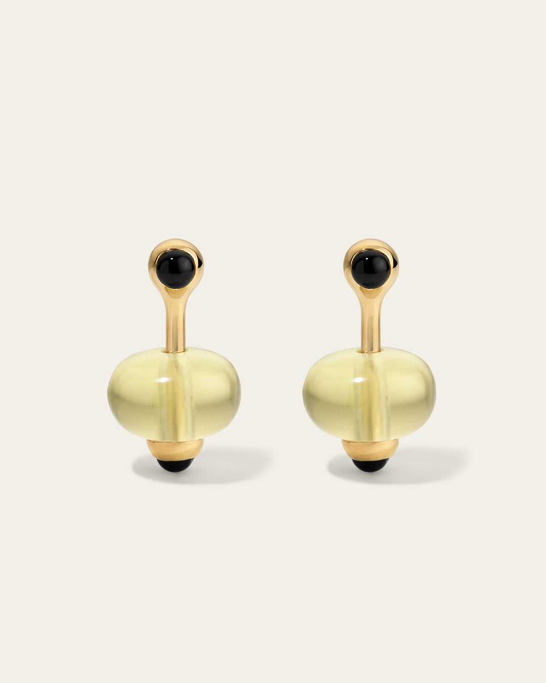 These drop earrings are crafted in 18K gold and feature a sliding lemon quartz bead. Each end is elegantly accented with a 3 mm black spinel cabochon.