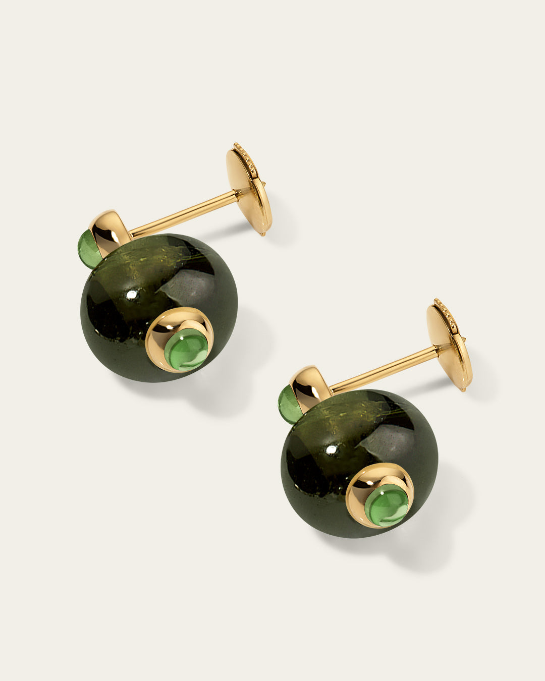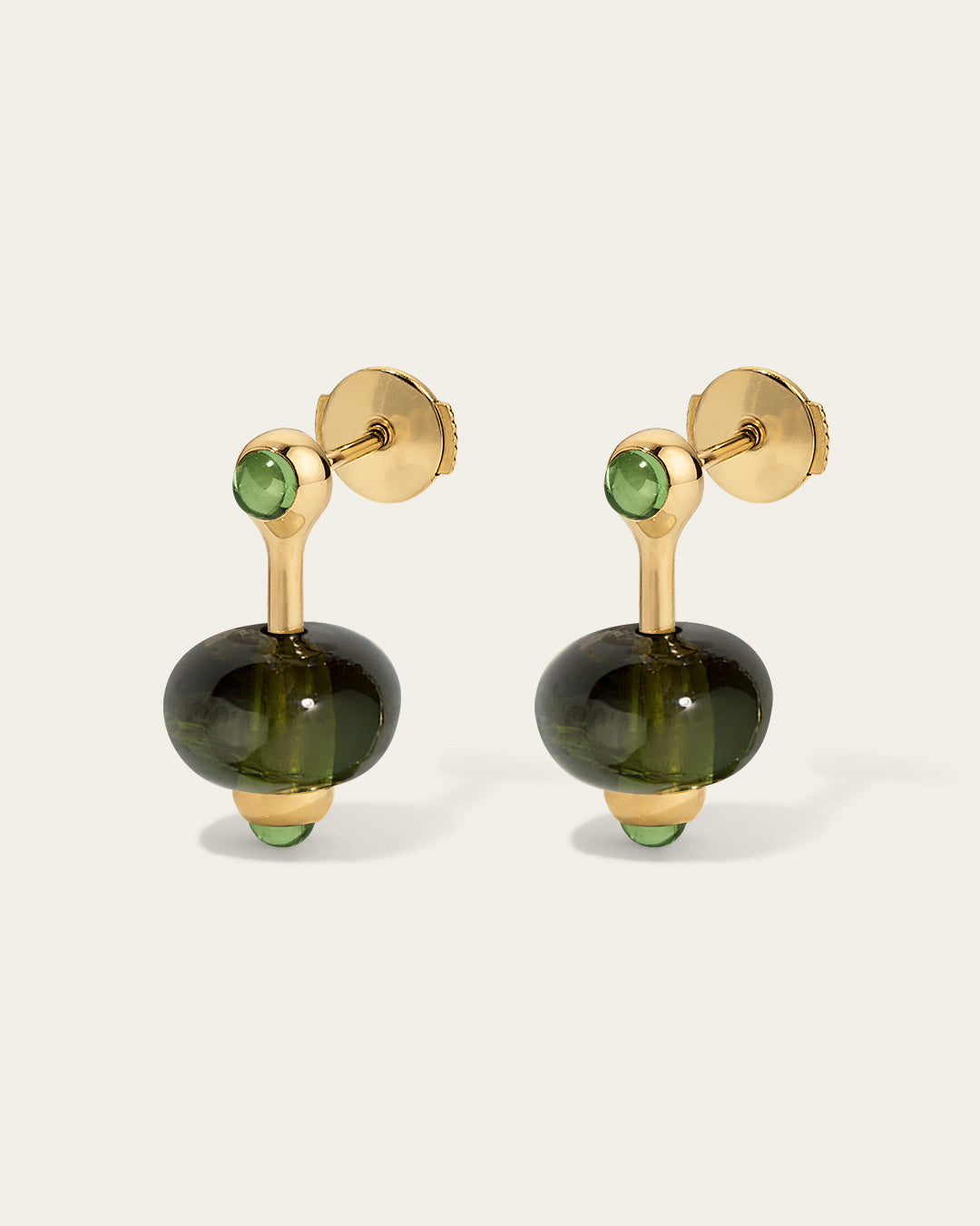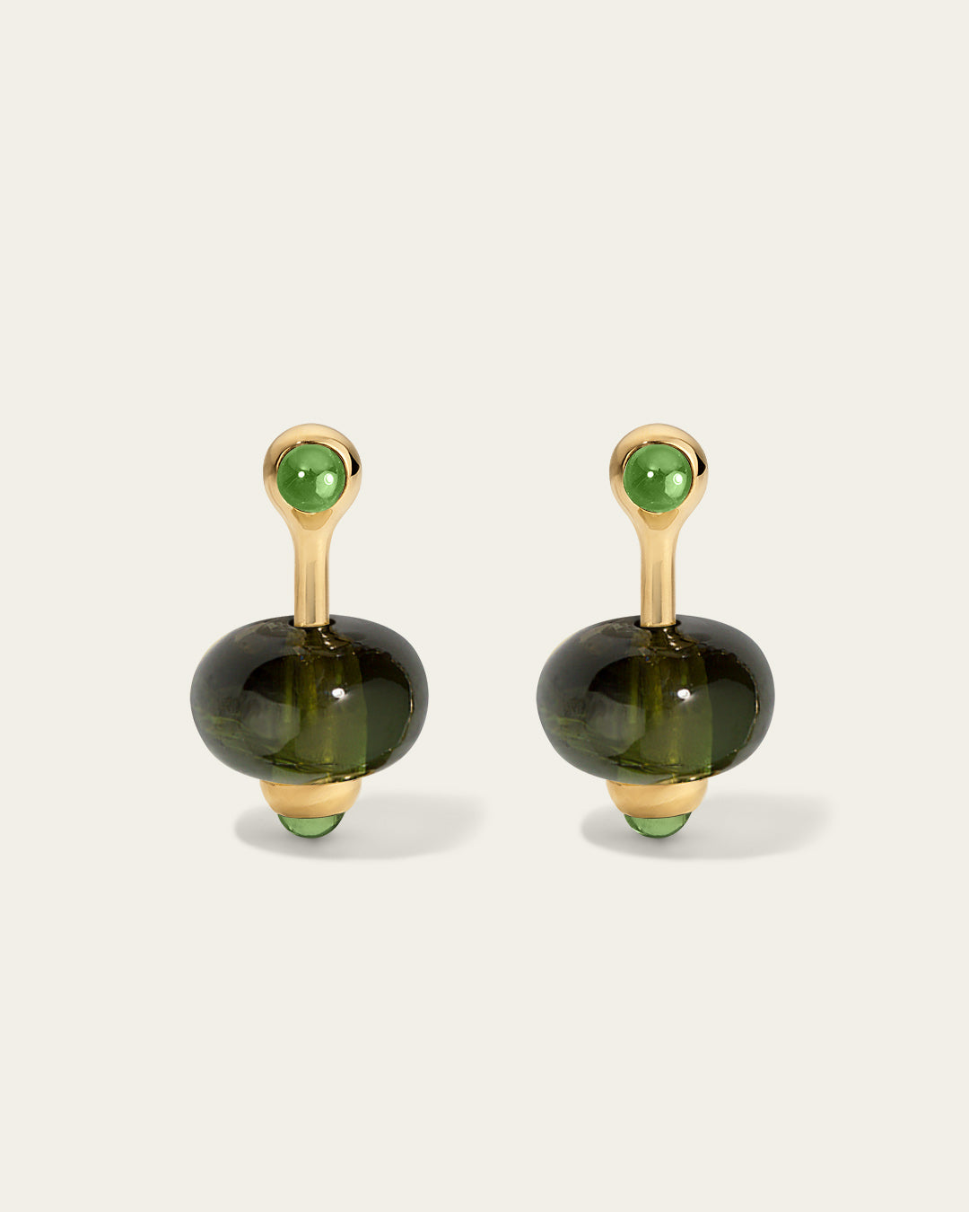 These drop earrings are crafted in 18K gold and feature a sliding tourmaline bead. Each end is elegantly accented with a 3 mm tsavorite garnet cabochon.