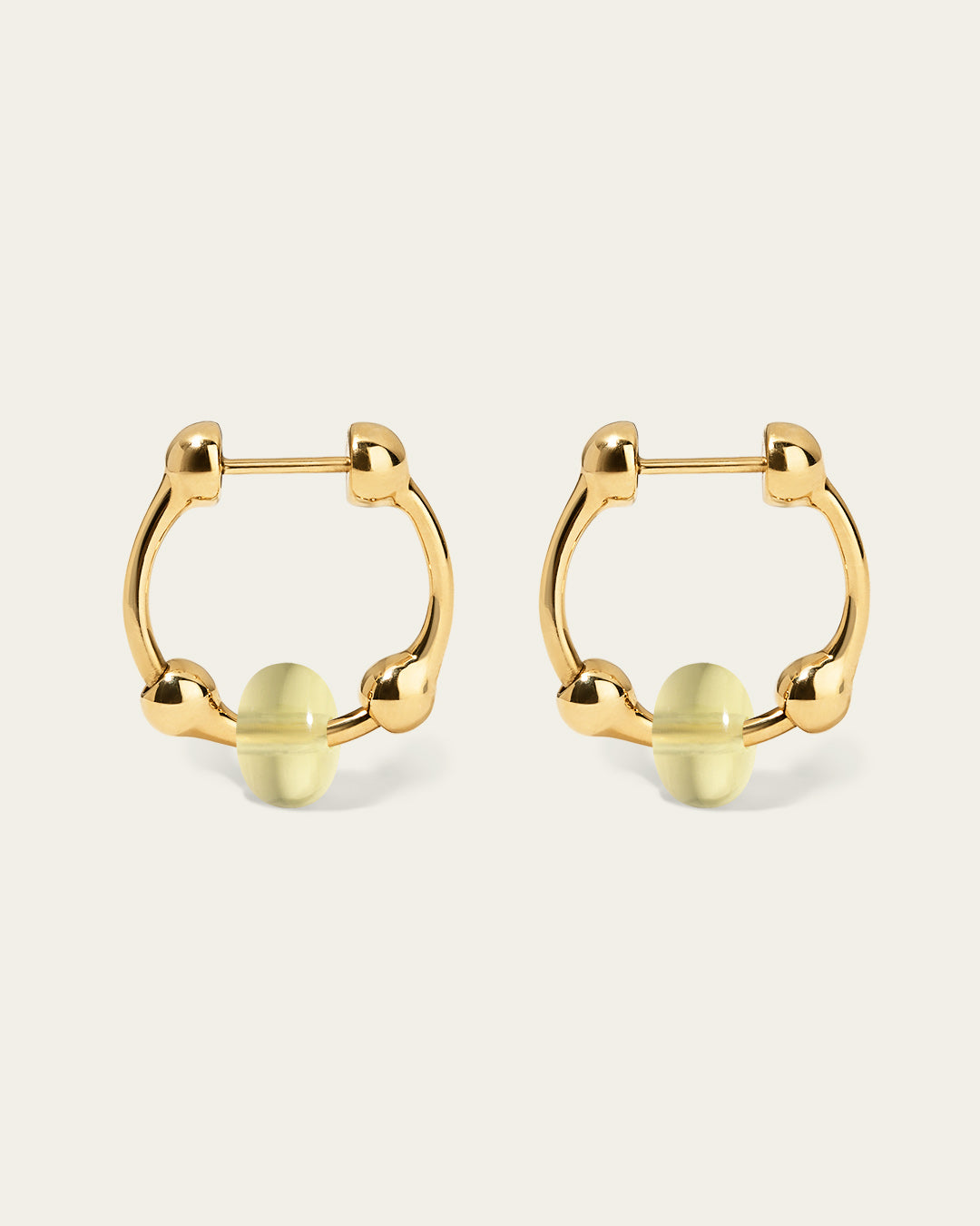 18K gold SES chain hoop earrings feature a proprietary linking system and a sliding lemon quartz bead on the middle link.
