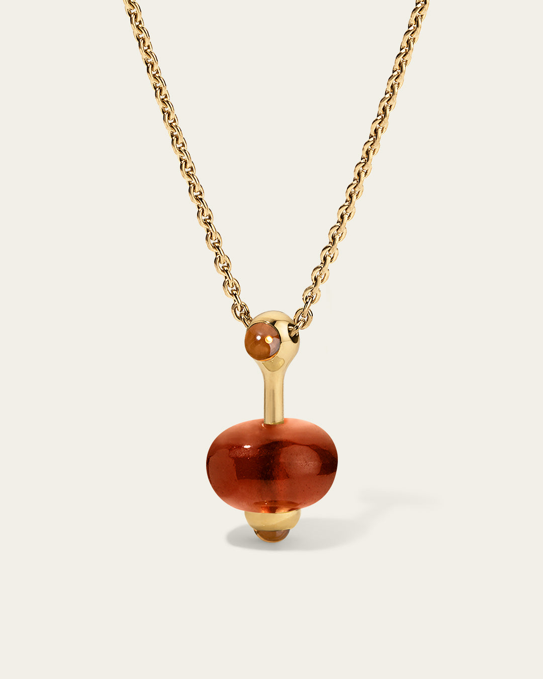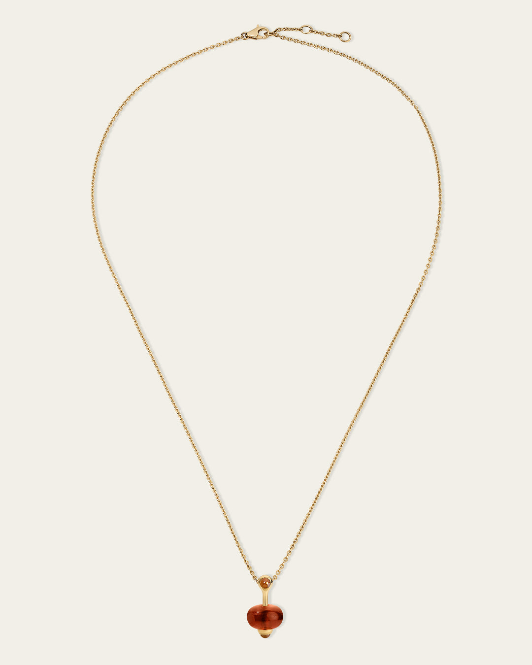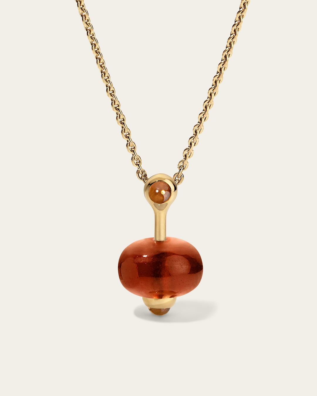 This necklace features an 18K gold drop design with a sliding hessonite garnet bead. Each end is elegantly accented by a 3 mm orange sapphire cabochon.