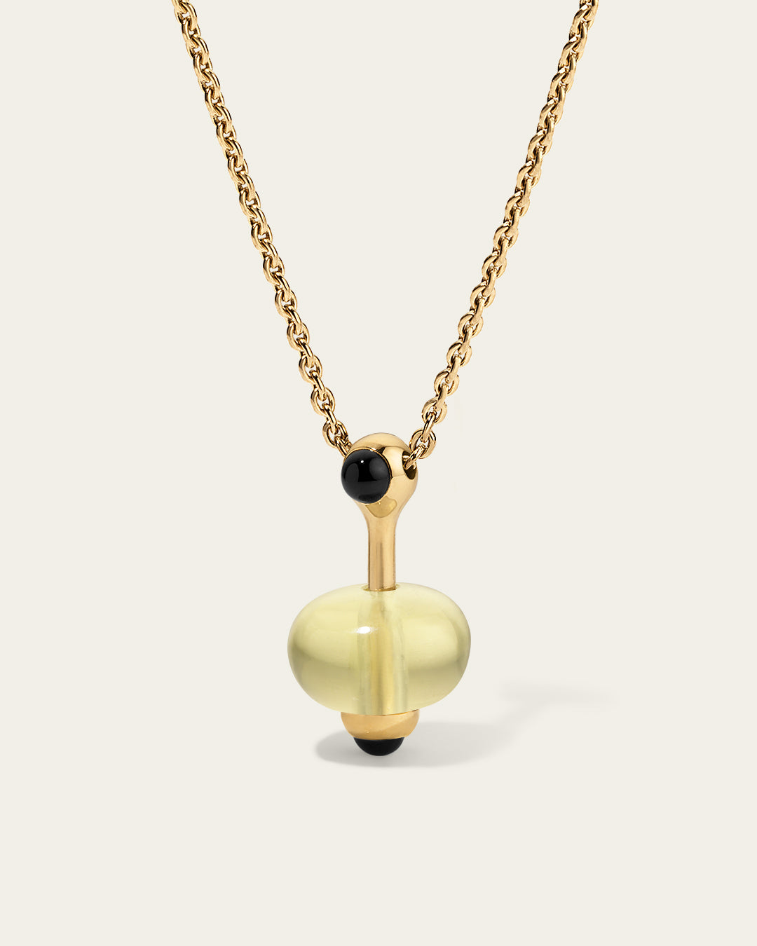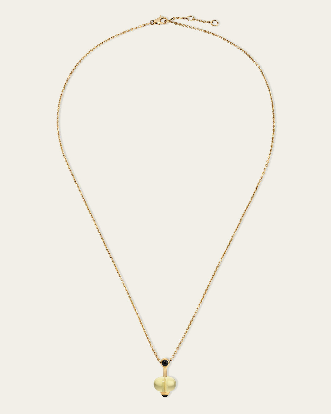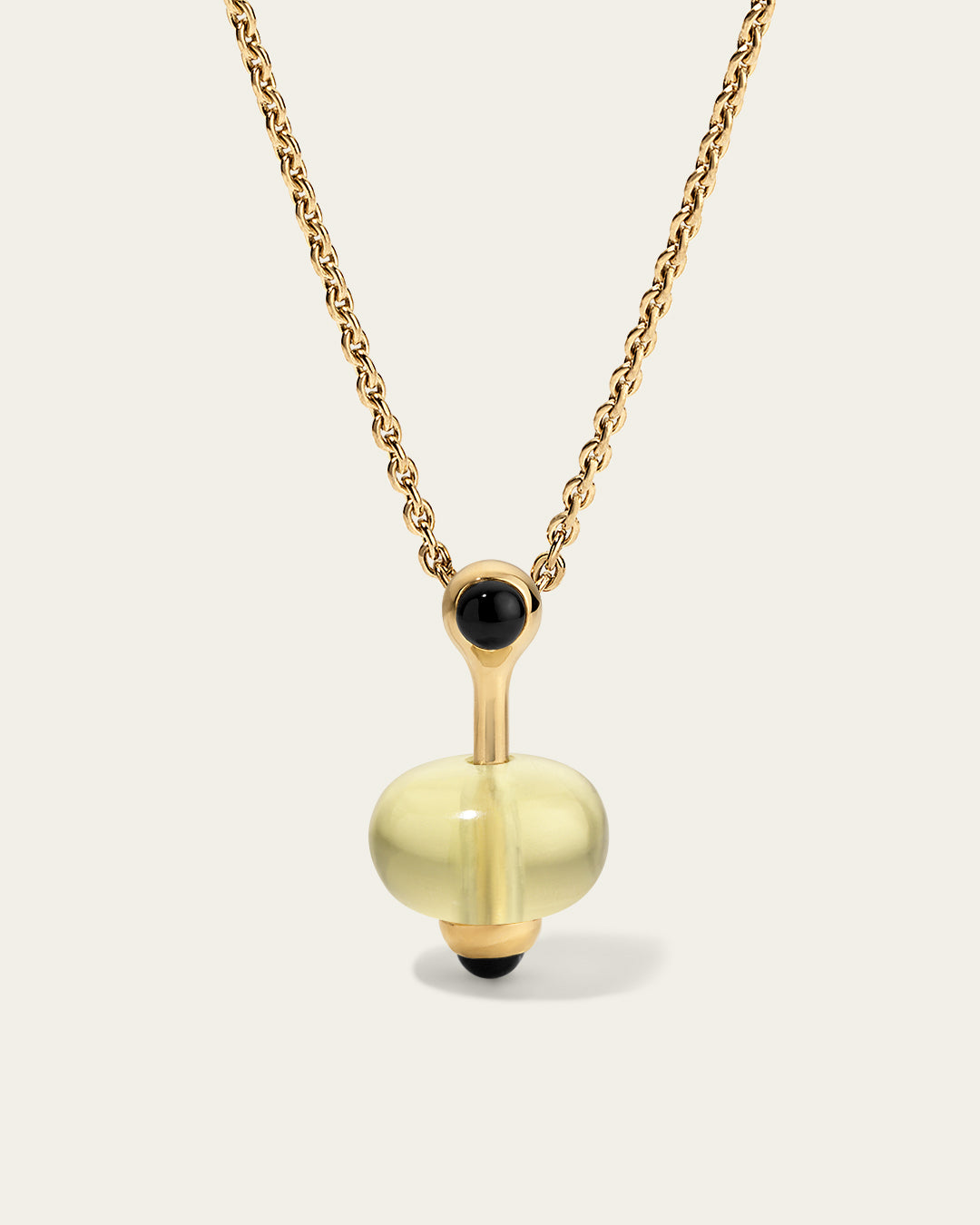 18K gold drop necklace featuring a sliding lemon quartz bead and 3 mm black spinel cabochons at each end.