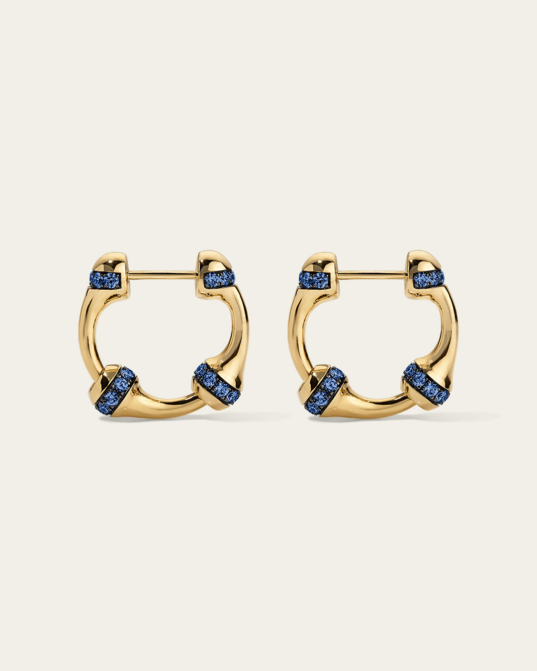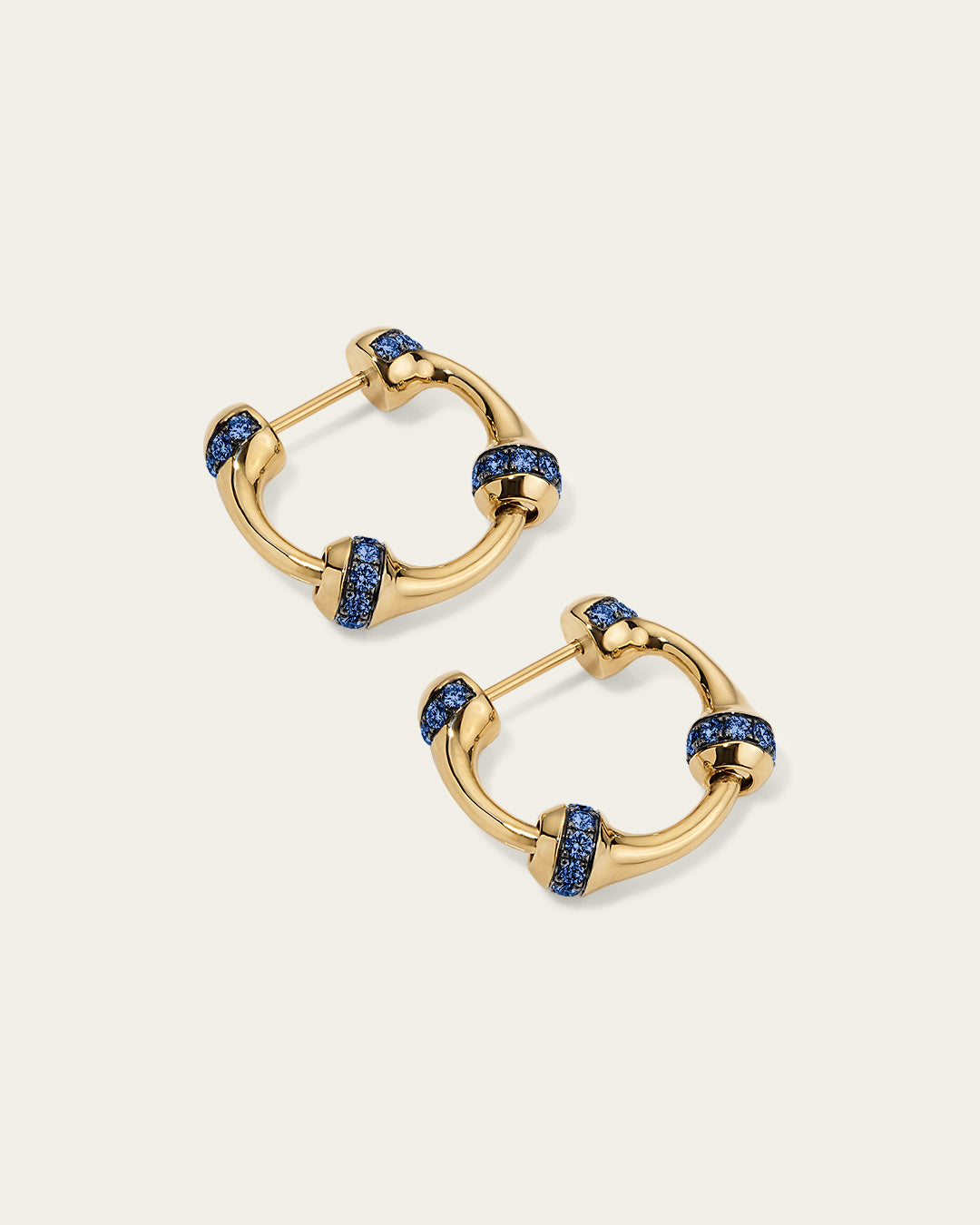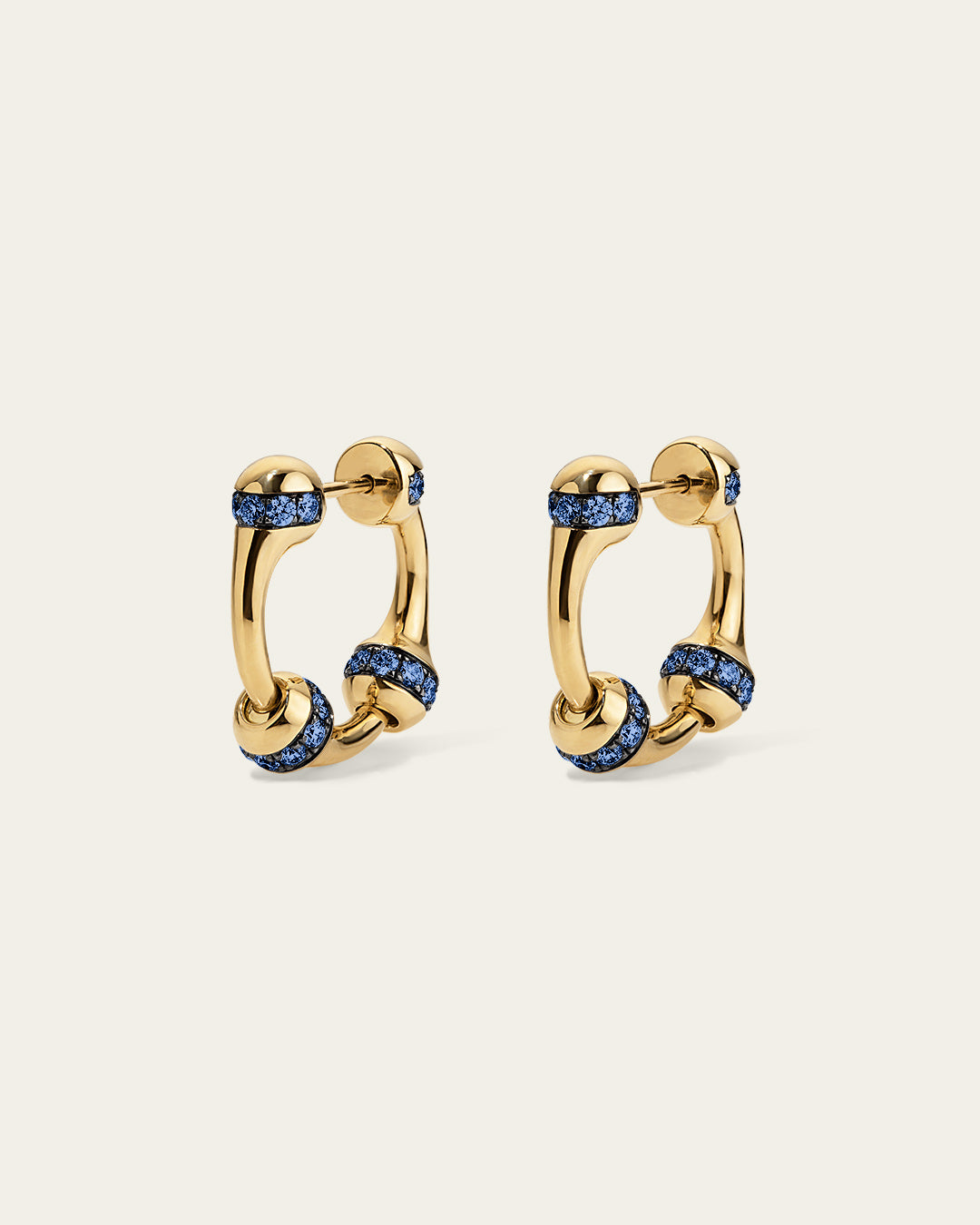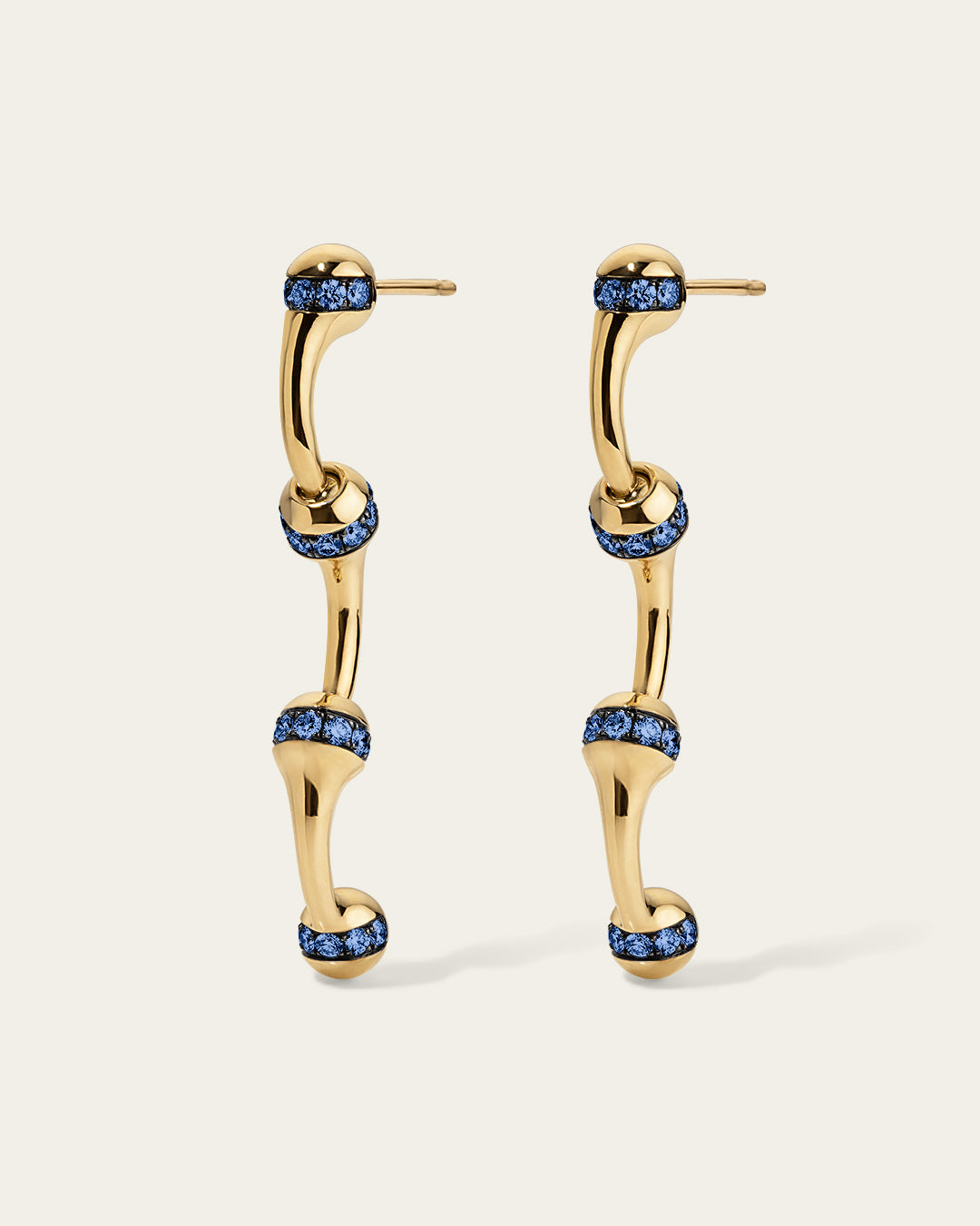 Large Signature SES chain hoop earrings in 18K gold feature a proprietary linking system for versatile wear as hoops or drops. Each link includes a row of 1.8 mm pavé-set blue sapphires in blackened gold.