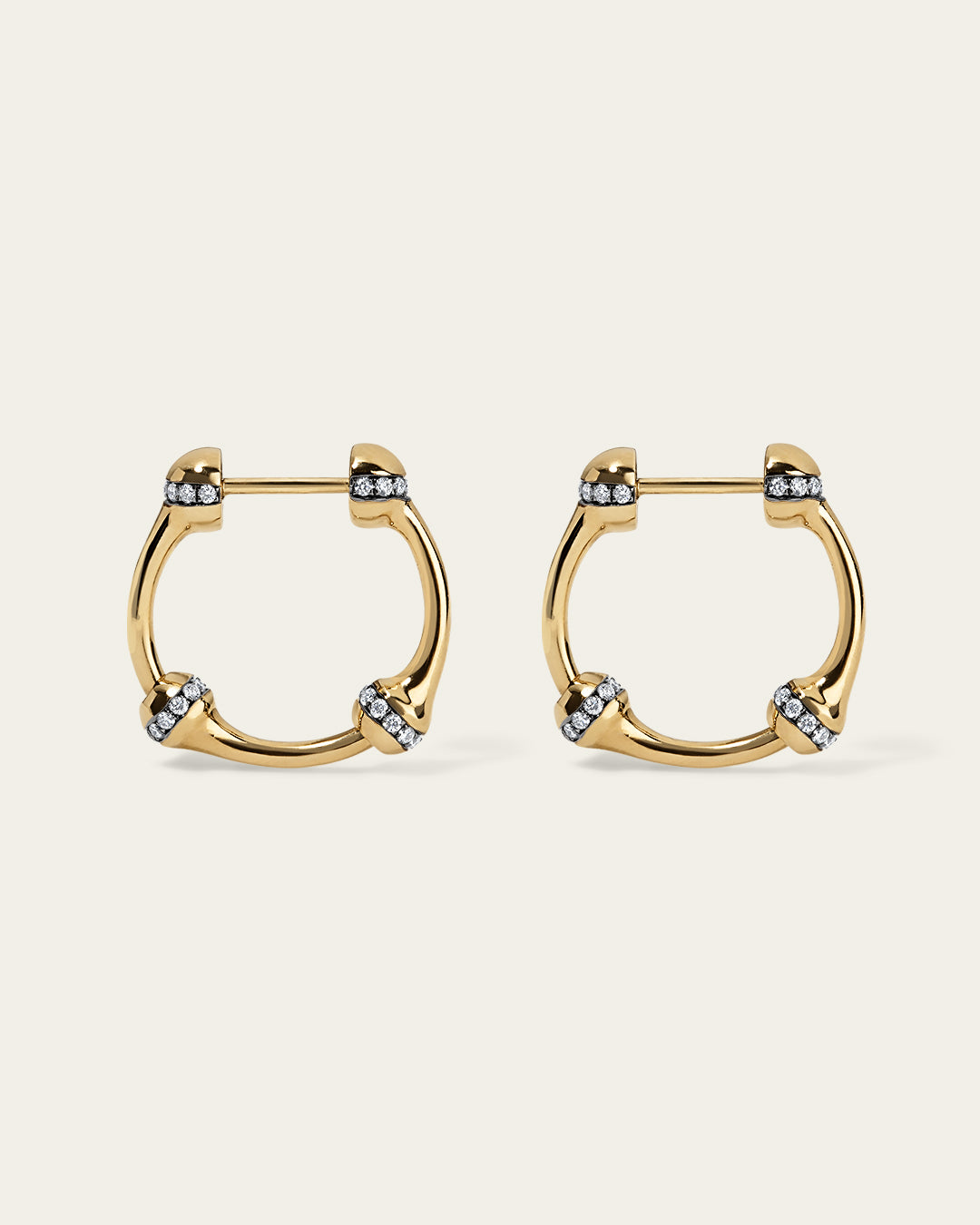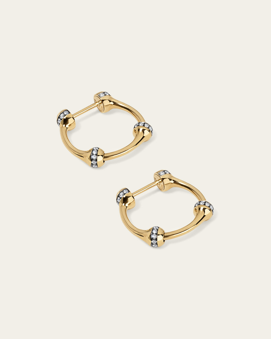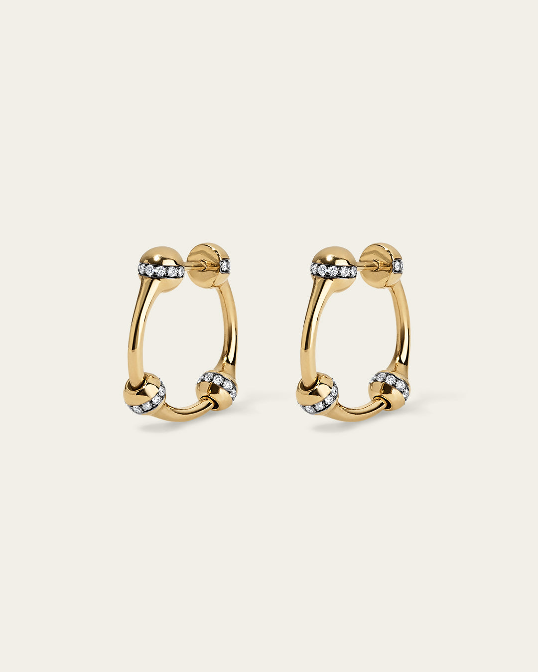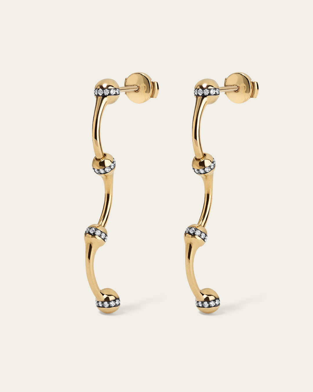 Signature SES chain hoop earrings in 18K gold with proprietary linking system allowing these earrings to be worn as either hoops or drops. Each link has an accent row of 1 mm pavé-set Diamond set in blackened gold.