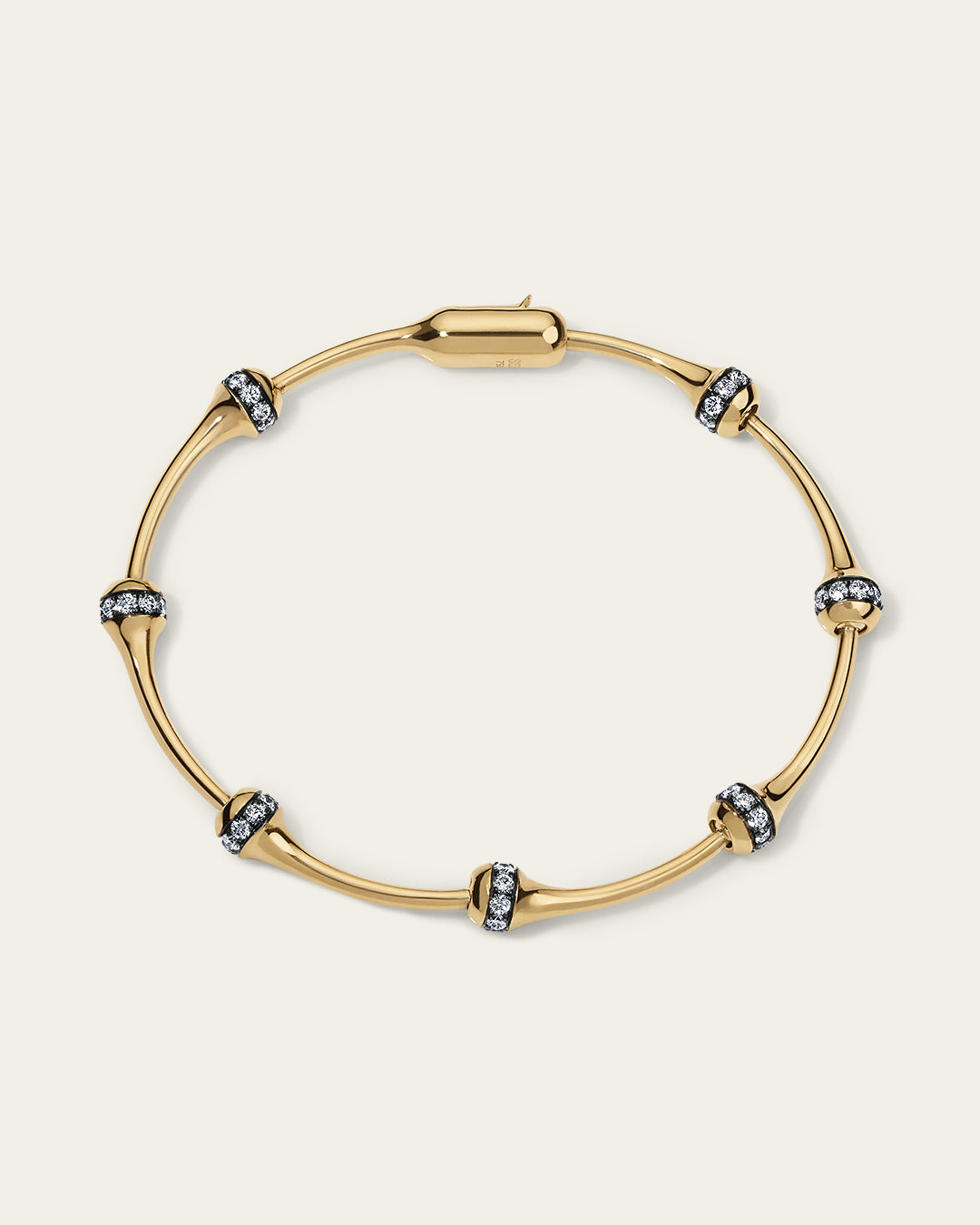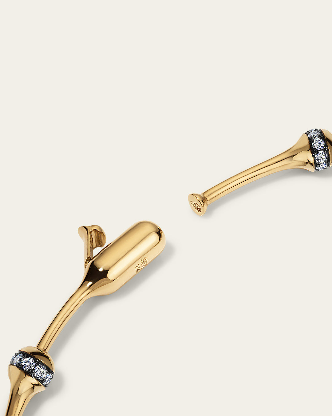 The signature SES chain bracelet is crafted from 18K gold and features a proprietary linking system and clasp. Each large-sized link is adorned with an accent row of 1.8 mm pavé-set diamonds in blackened gold.