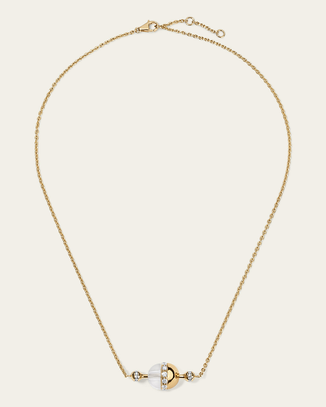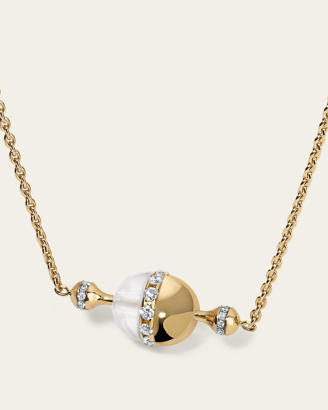 18K gold bar necklace featuring a sliding rock crystal hemisphere with a gold dome. The magnifying crystal reveals a hidden ruby, tsavorite garnet, blue, orange, and purple sapphires, all bordered by a 2 mm diamond rim.