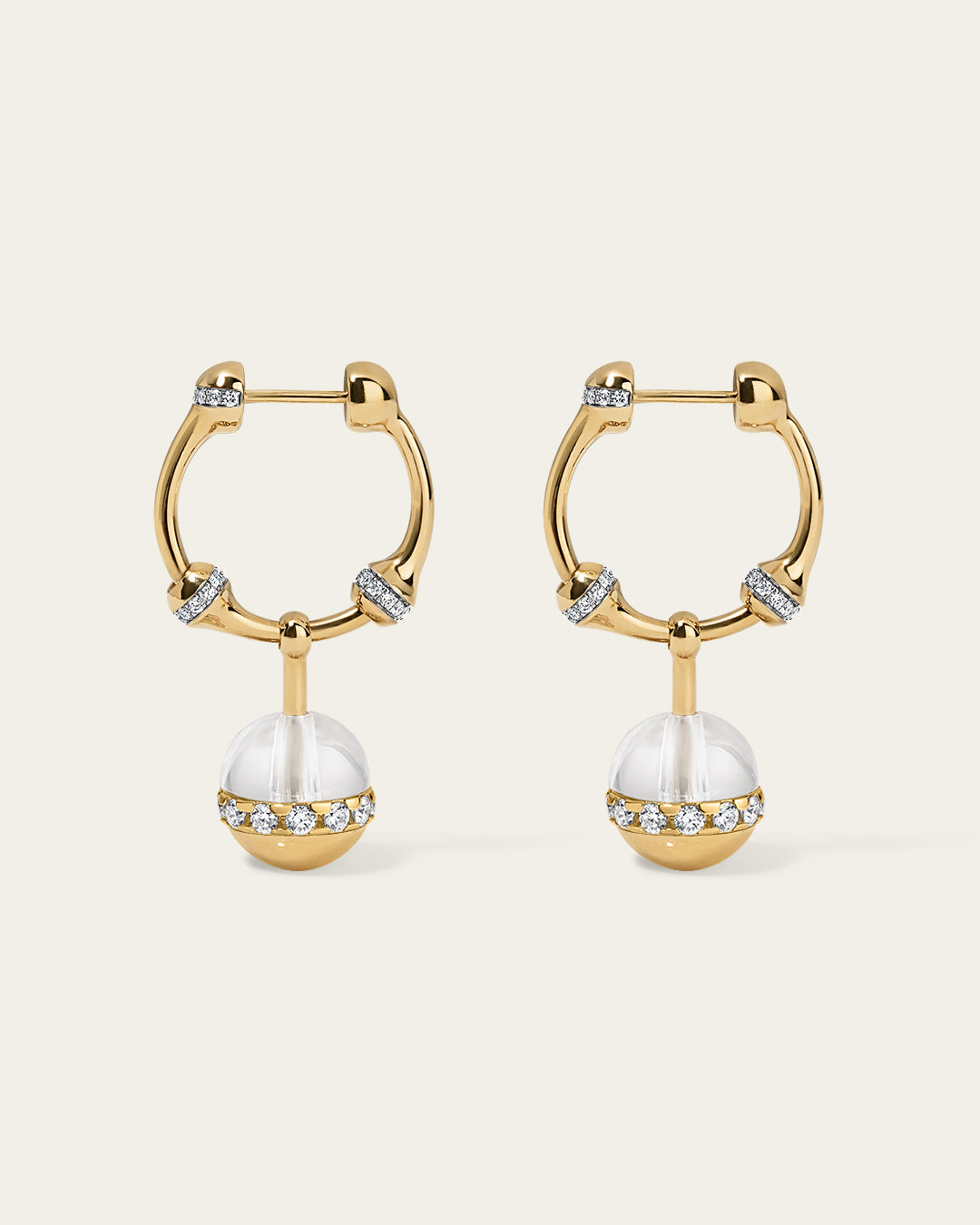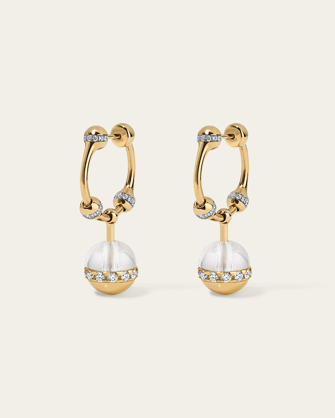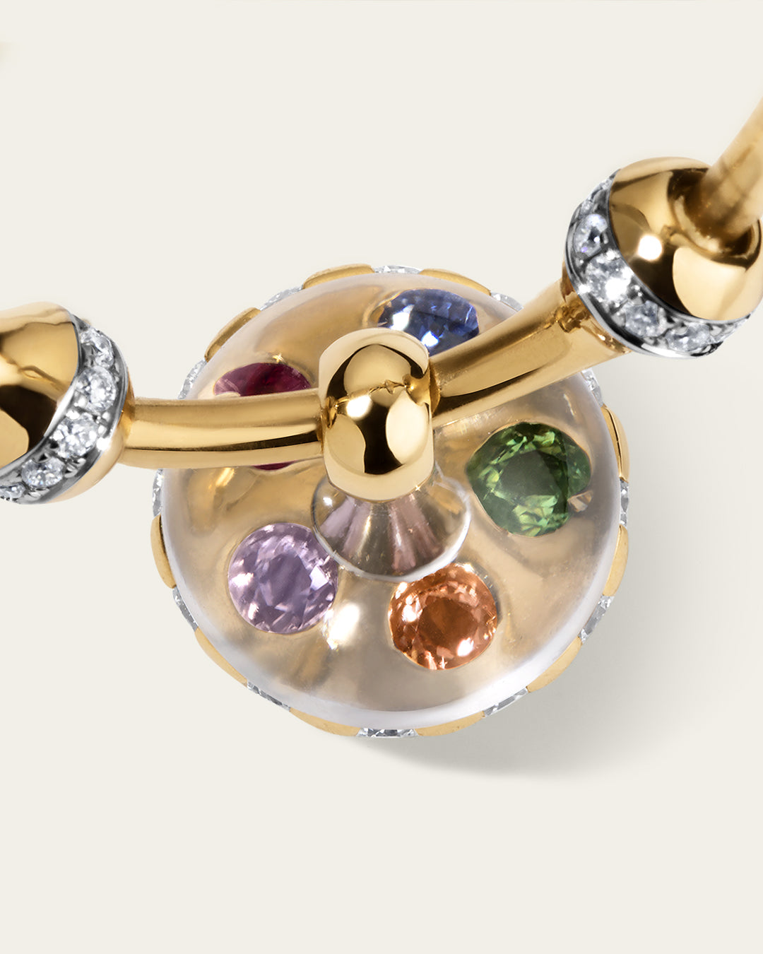 Signature SES chain hoop earrings feature a drop with a sliding rock crystal hemisphere and gold dome. Inside the lower dome are ruby, tsavorite garnet, blue, orange, and purple sapphires, bordered by 2 mm diamonds.