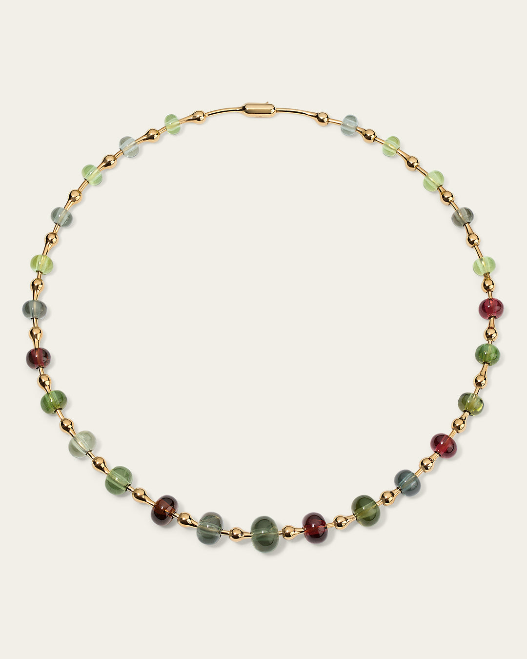 This necklace in 18K yellow gold is one of the signature piece of the chain collection. The links in this necklace allow just enough movement and fluidity to gently conform to the shape of your neck, while maintaining its structural look. This piece incorporates sliding Tourmaline beads threaded on to each link that move with the piece.