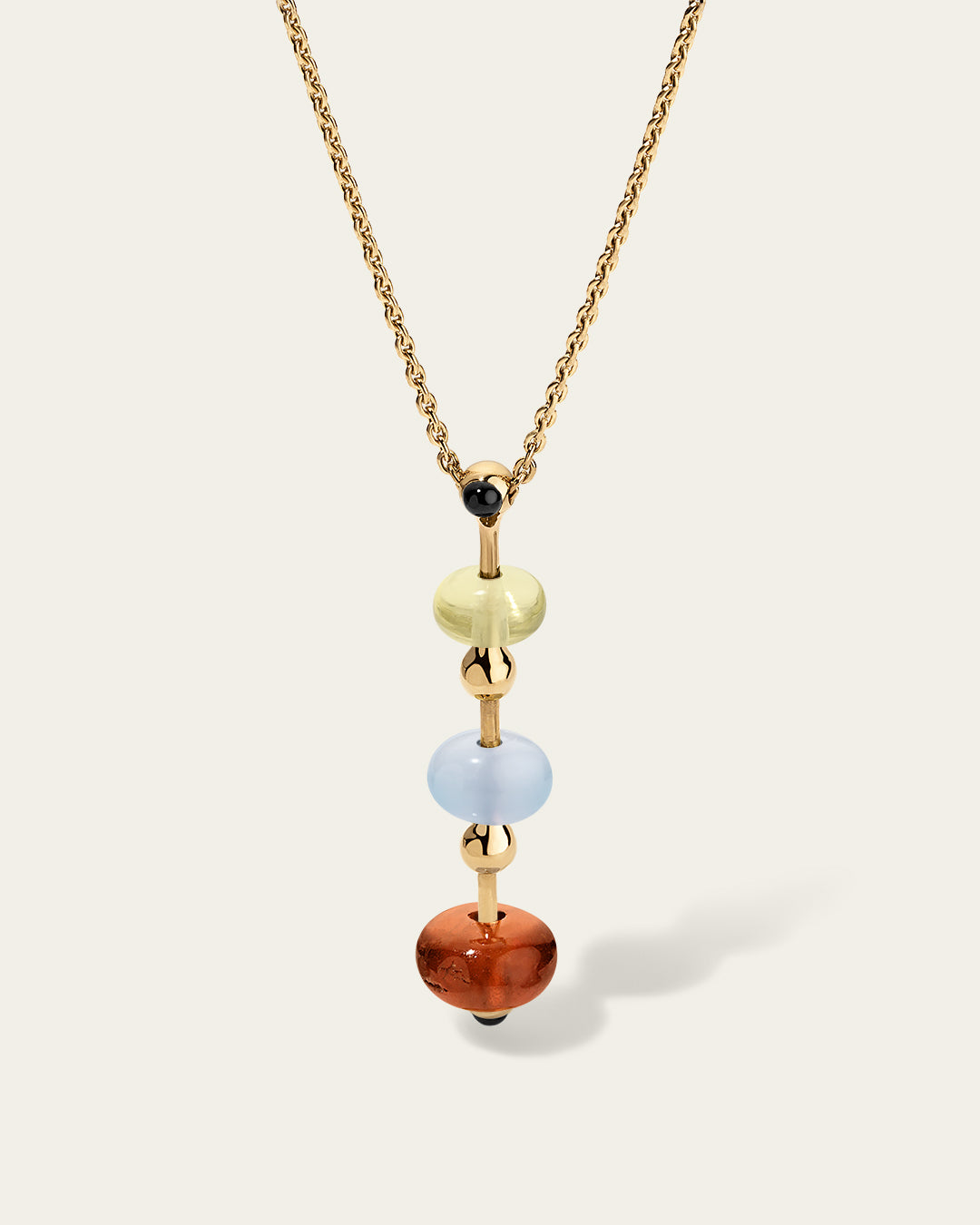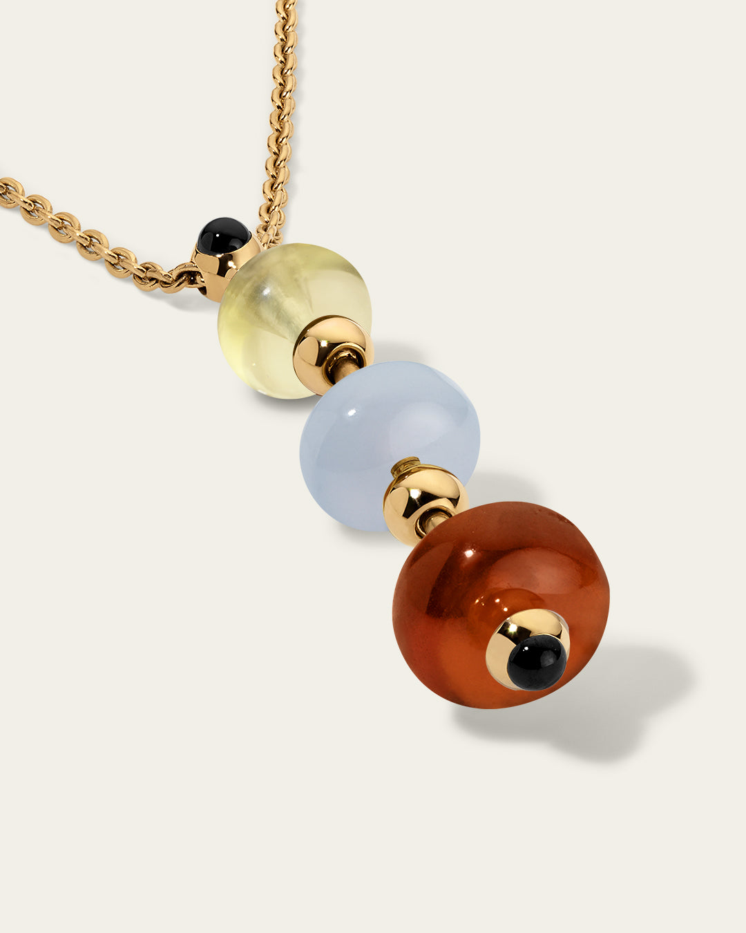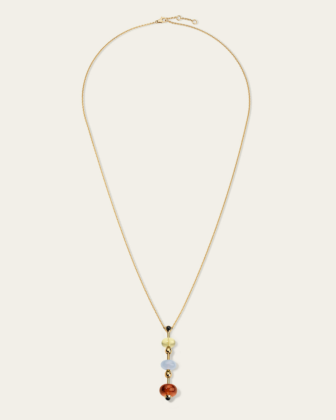 18K gold drop necklace featuring SES links with sliding stone beads—hessonite garnet, lemon quartz, and chalcedony. Each end is accented by a 3 mm black spinel cabochon.