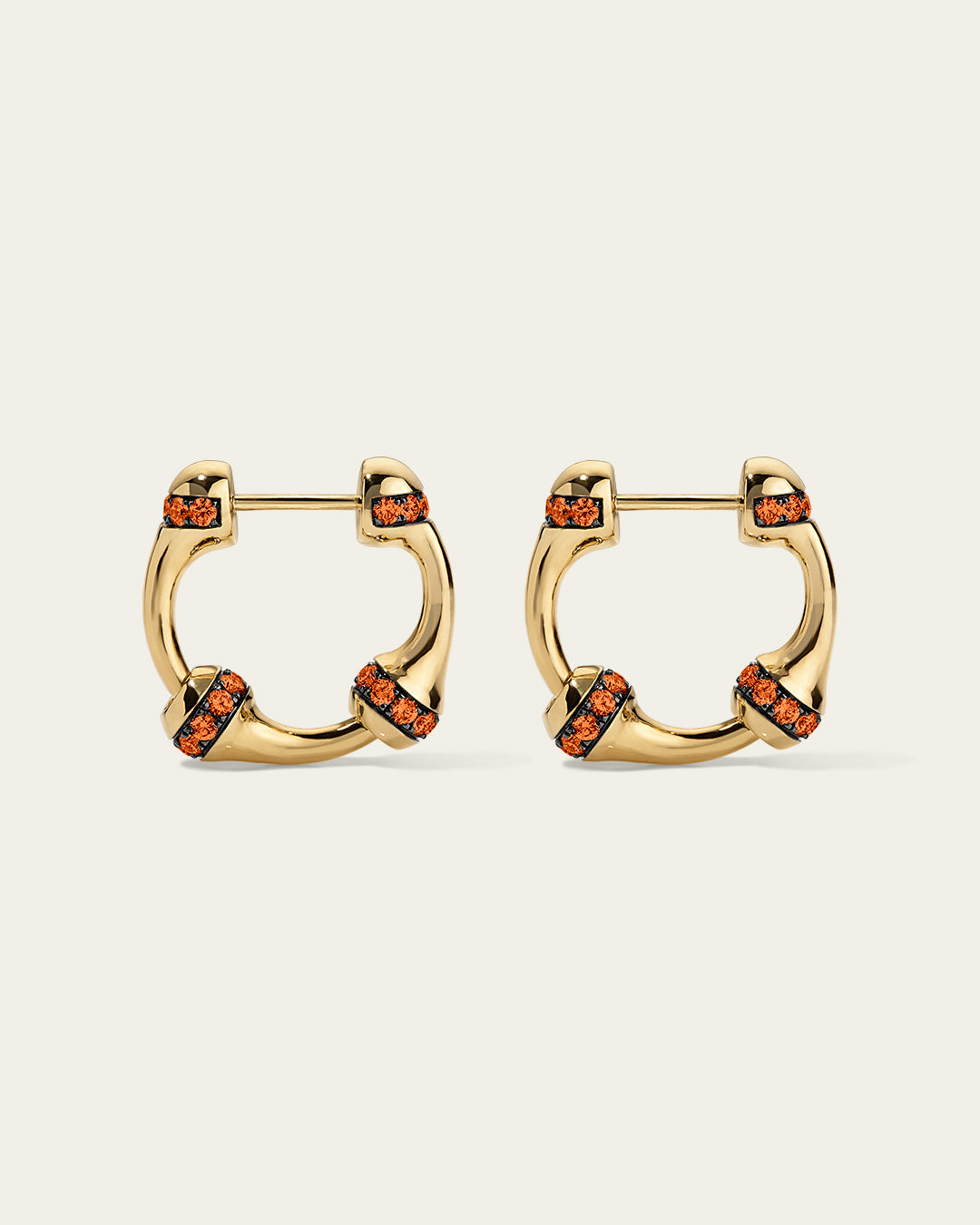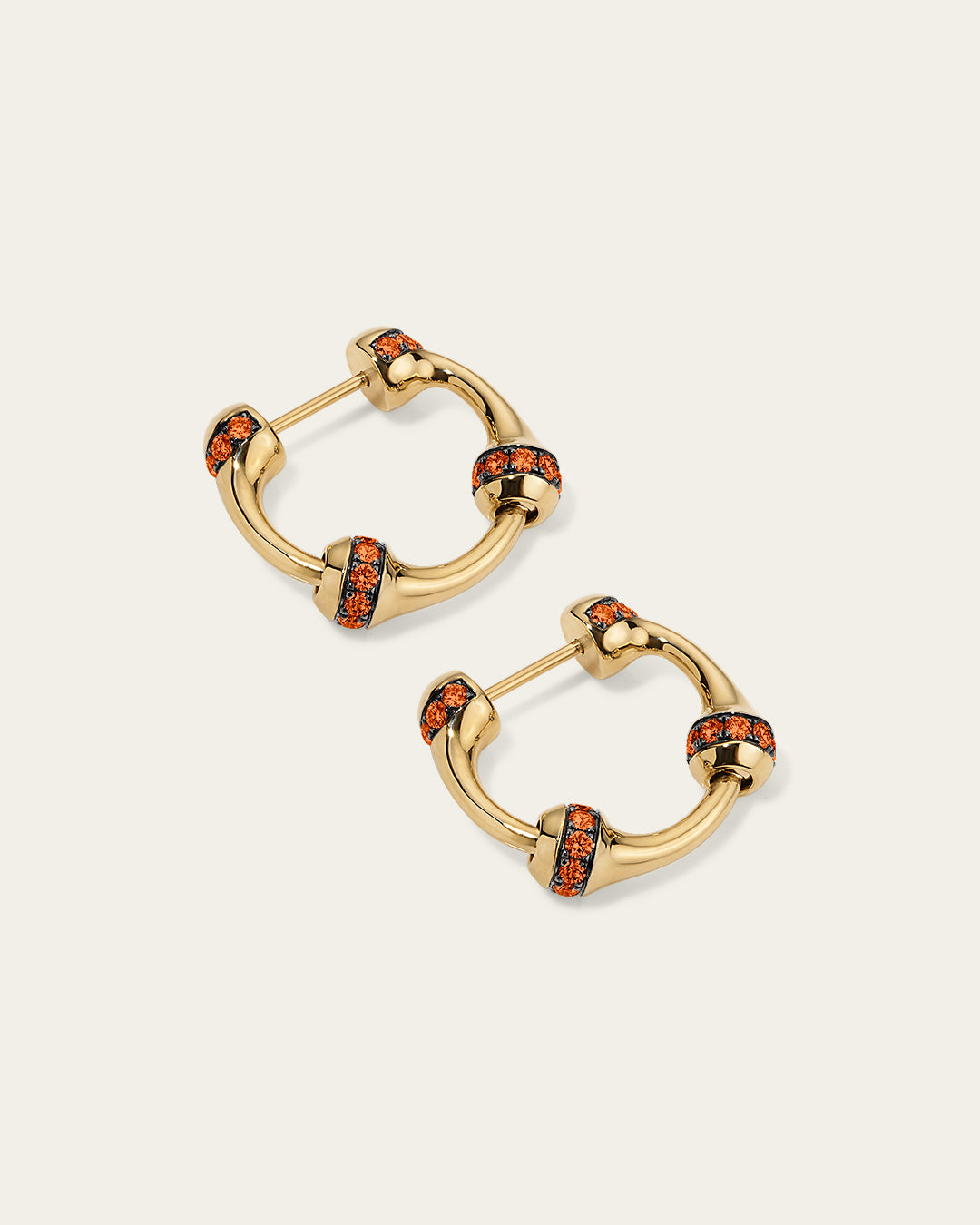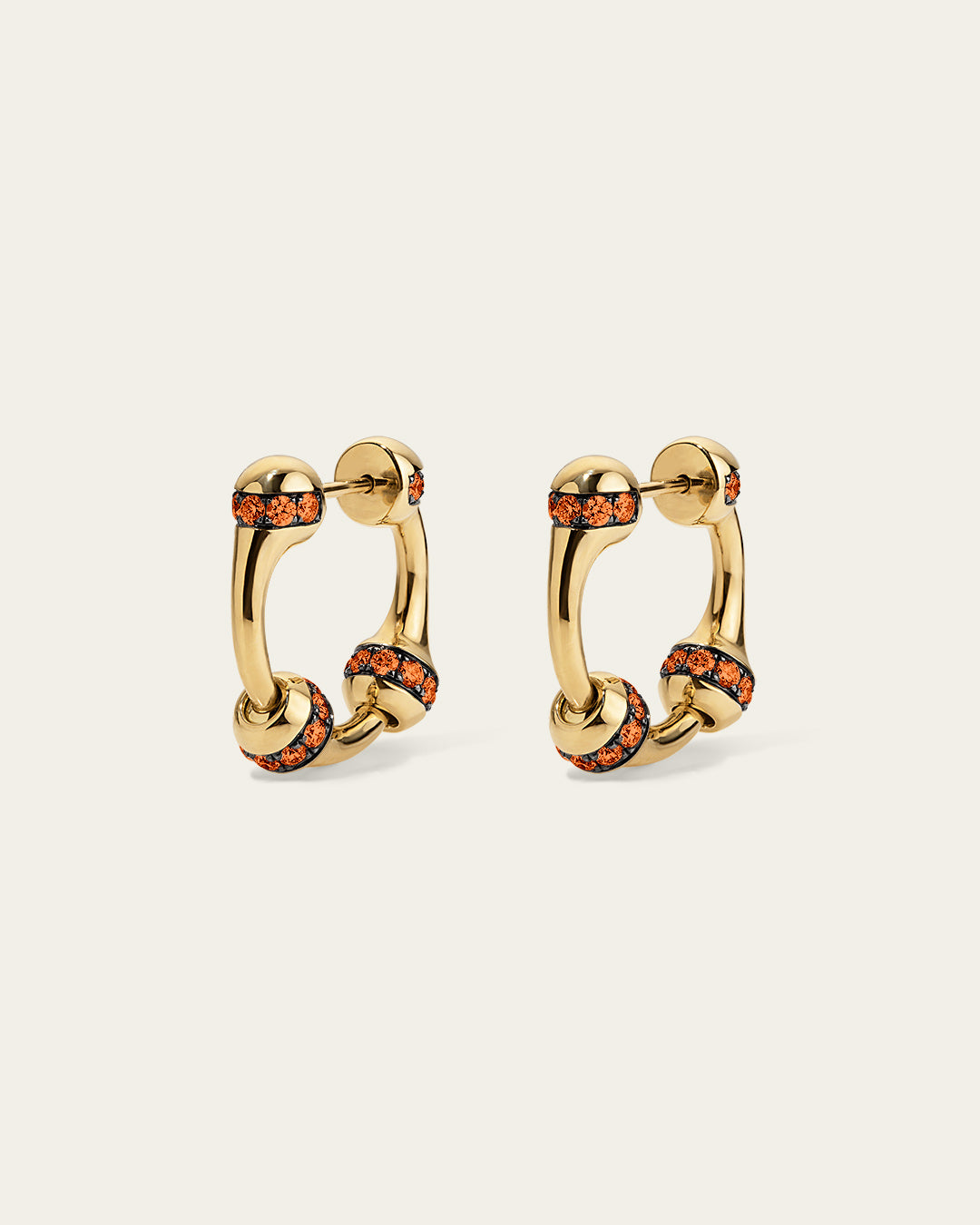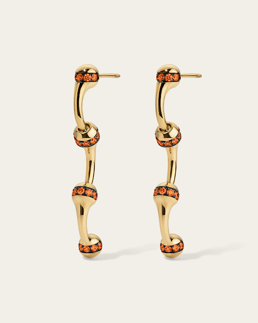 Signature SES chain hoop earrings in 18K gold feature a proprietary linking system for wear as hoops or drops. Each large link includes a row of 1.8 mm pavé-set orange sapphires in blackened gold.
