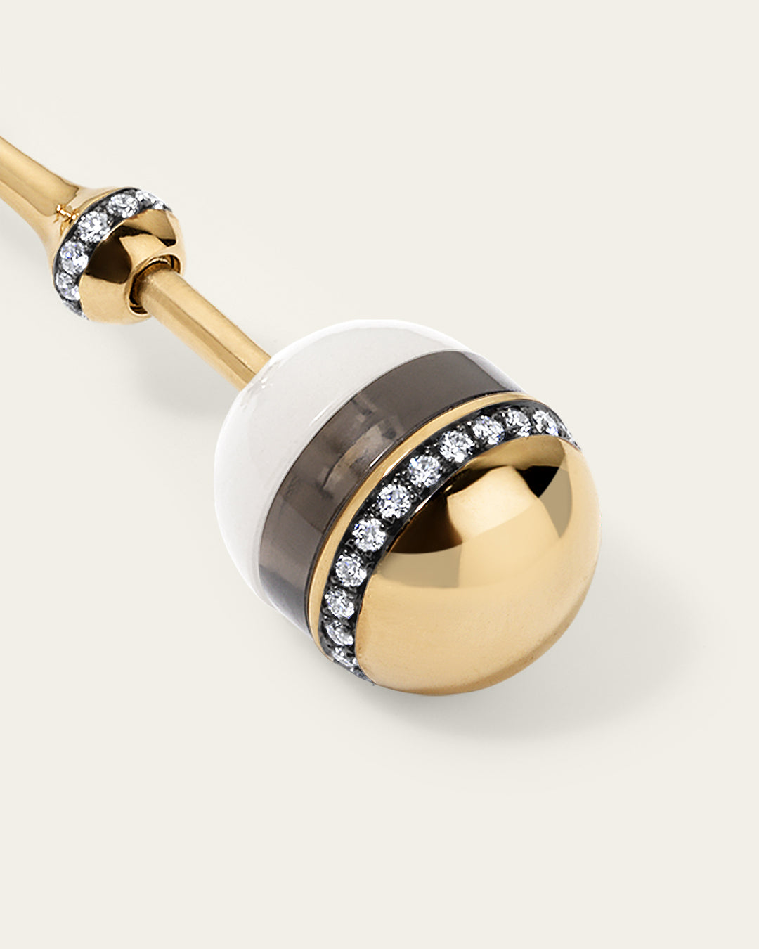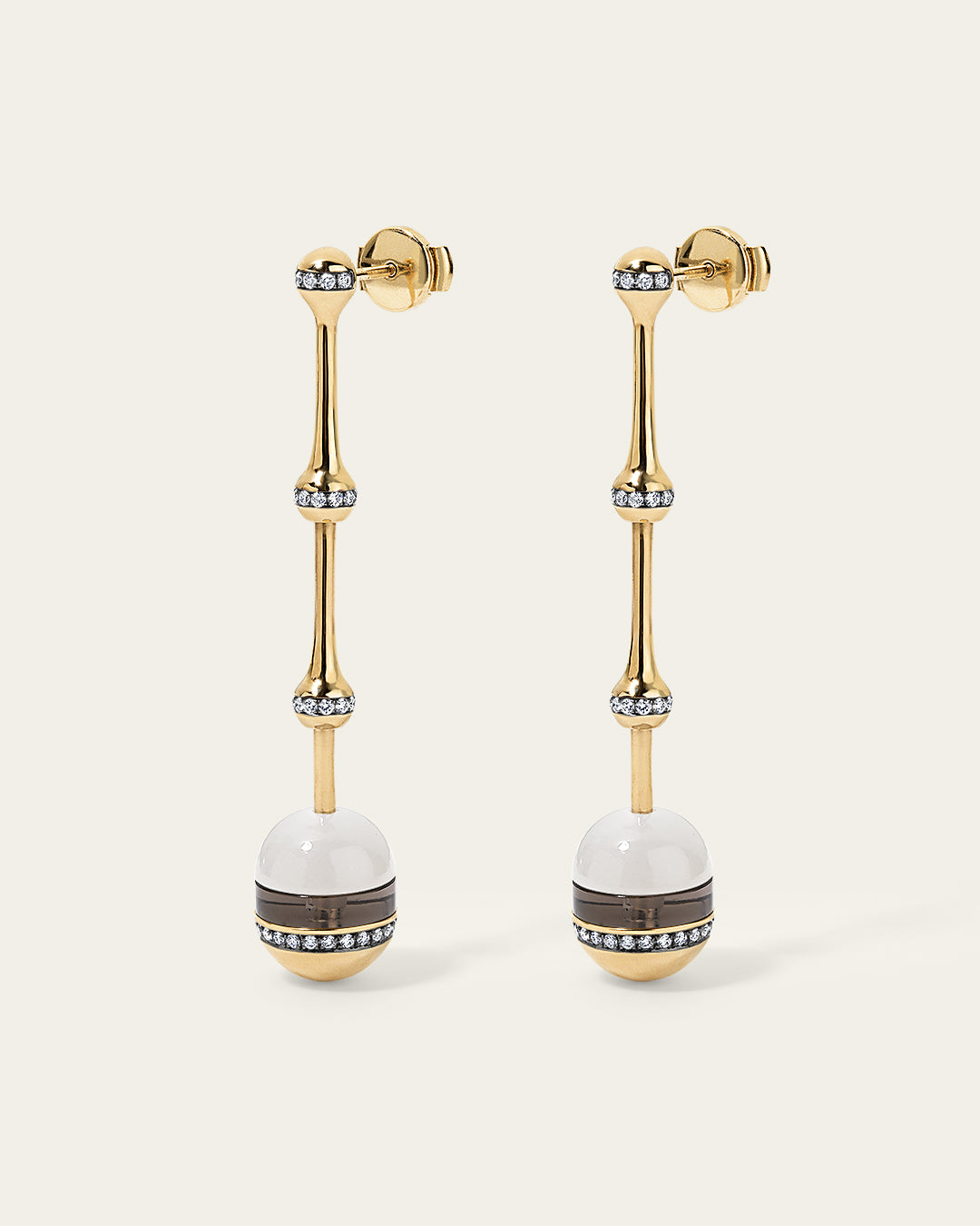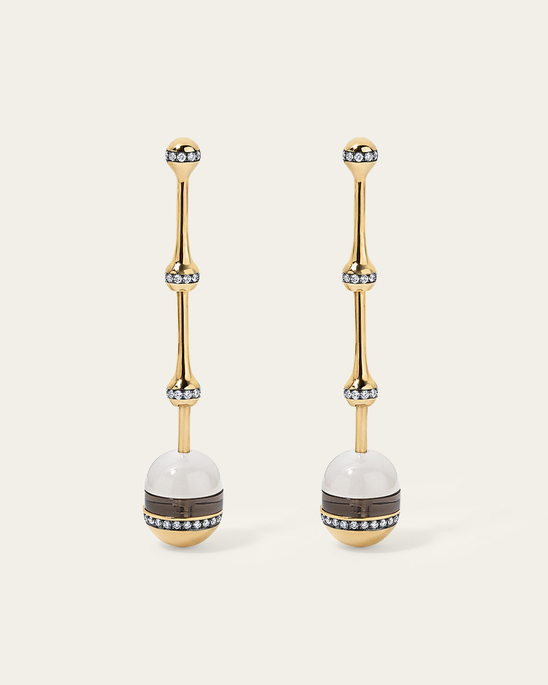 18K gold drop earrings feature SES links, sliding moonstone and smoky quartz stones, and a lower gold dome edged with pavé-set diamonds.