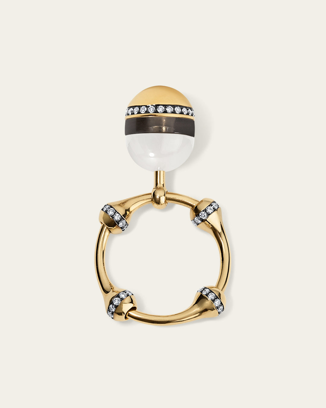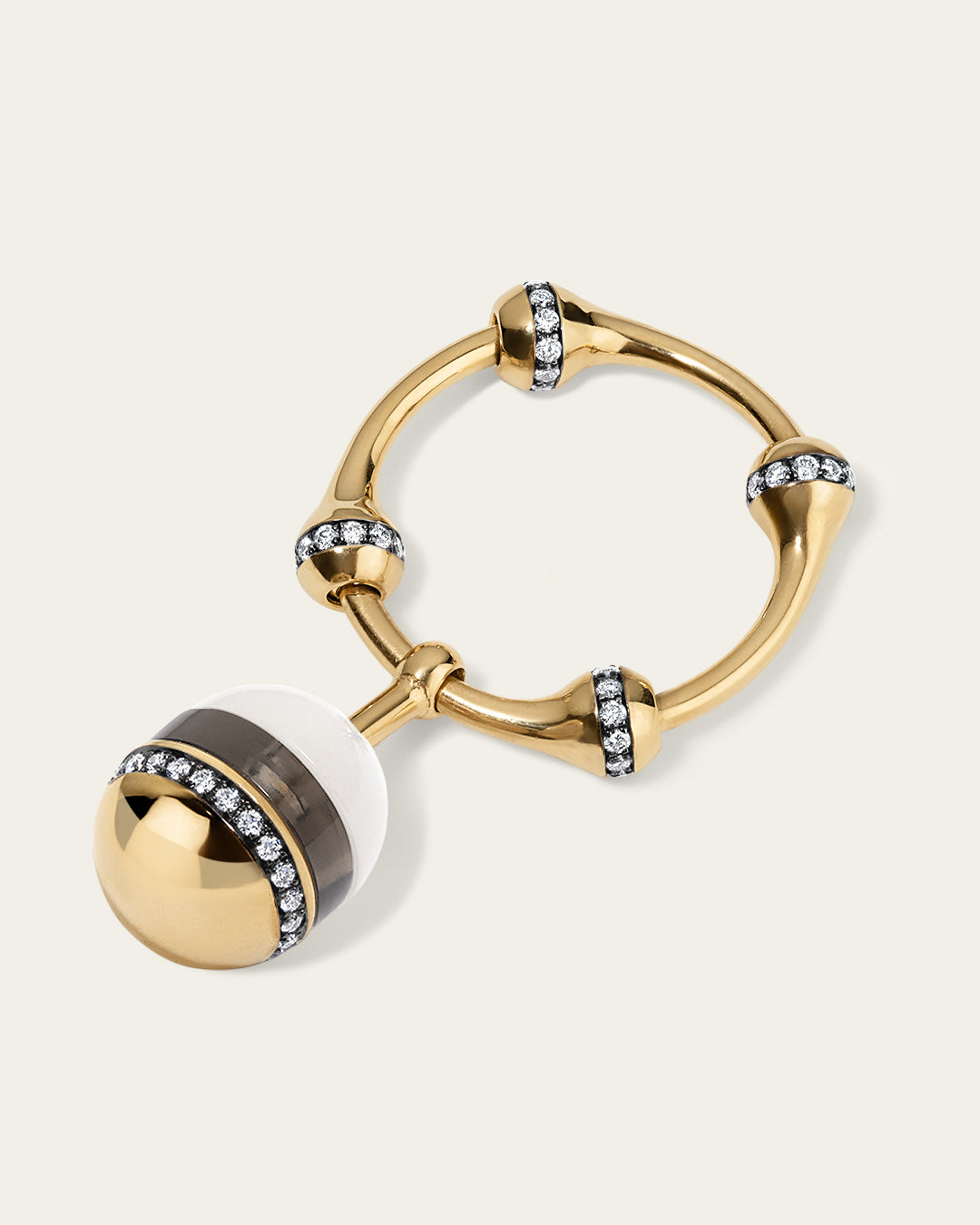 18K gold Signature SES chain ring featuring a proprietary linking system, a drop set with sliding moonstone and smoky quartz, and a lower gold dome edged in pavé diamonds.