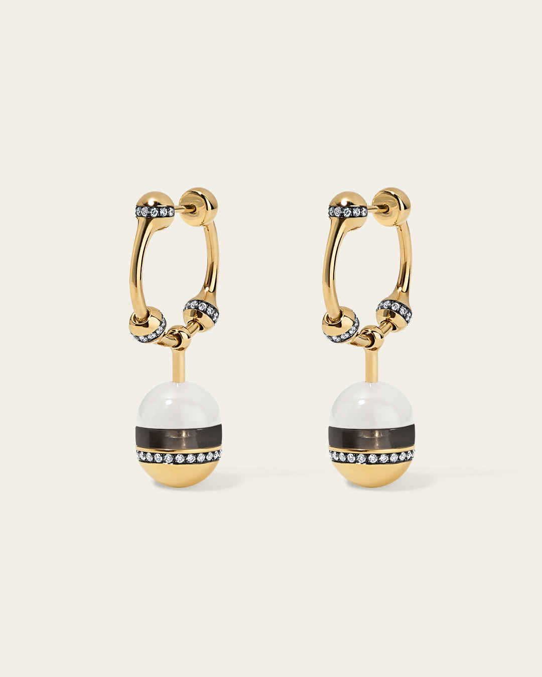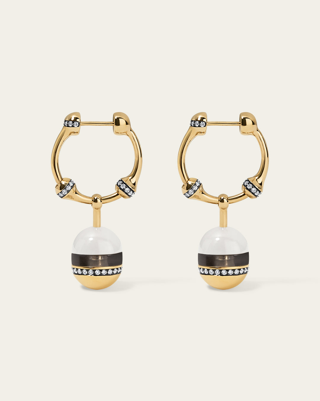 18K gold earrings feature sliding moonstone and smoky quartz stones, with a lower dome edged in pavé-set diamonds.