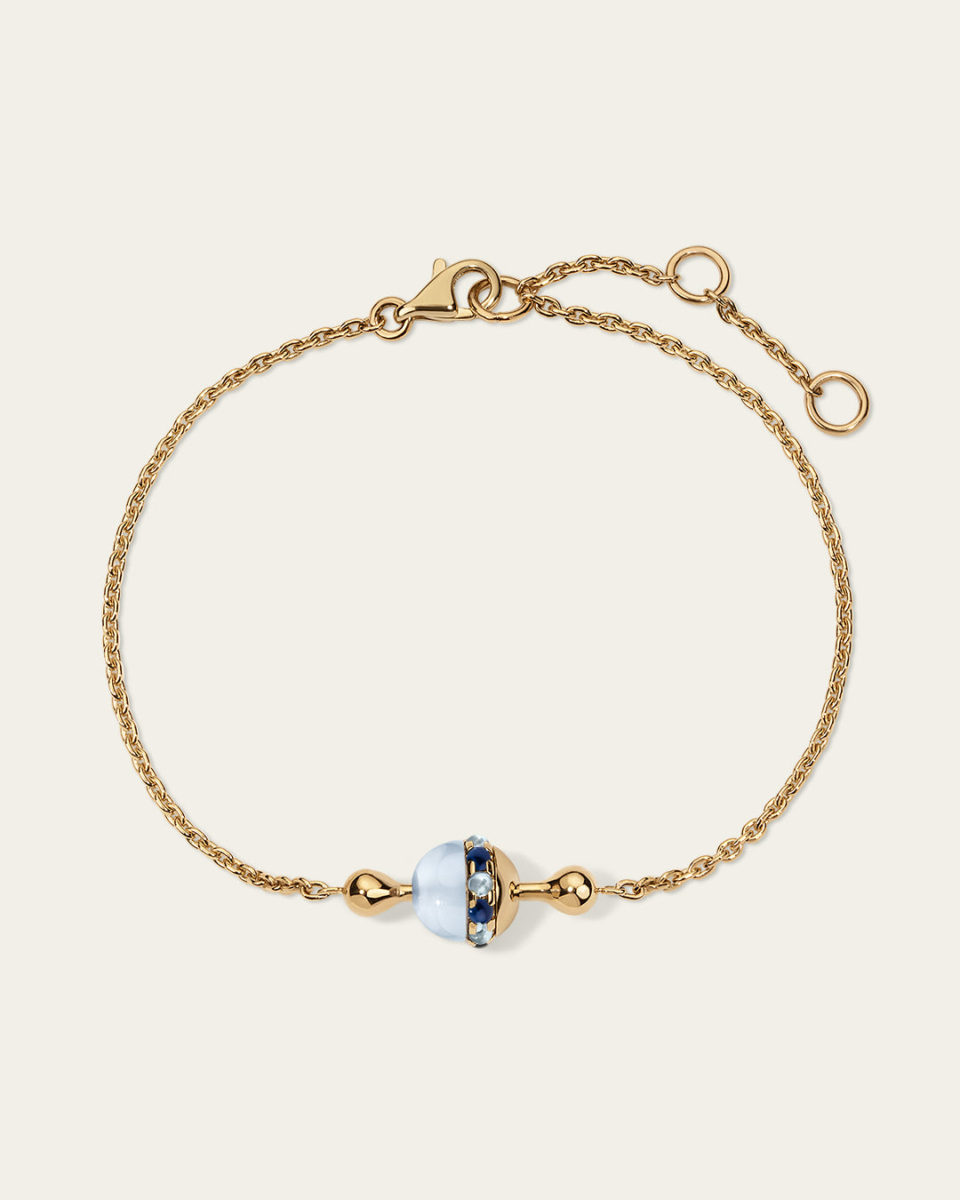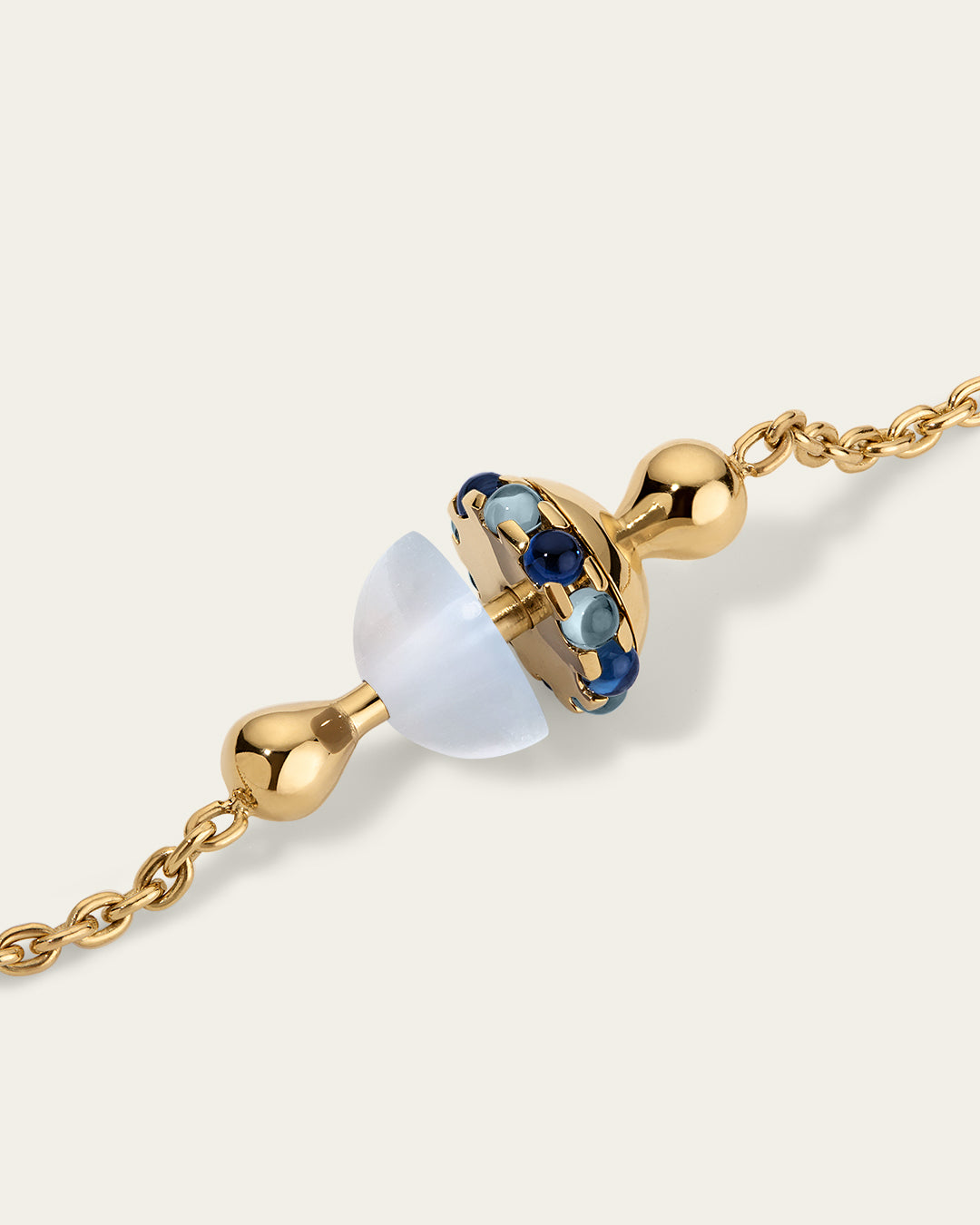 18K gold bar bracelet featuring a sliding chalcedony hemisphere bead, gold dome, and blue sapphire and spinel cabochon accents.