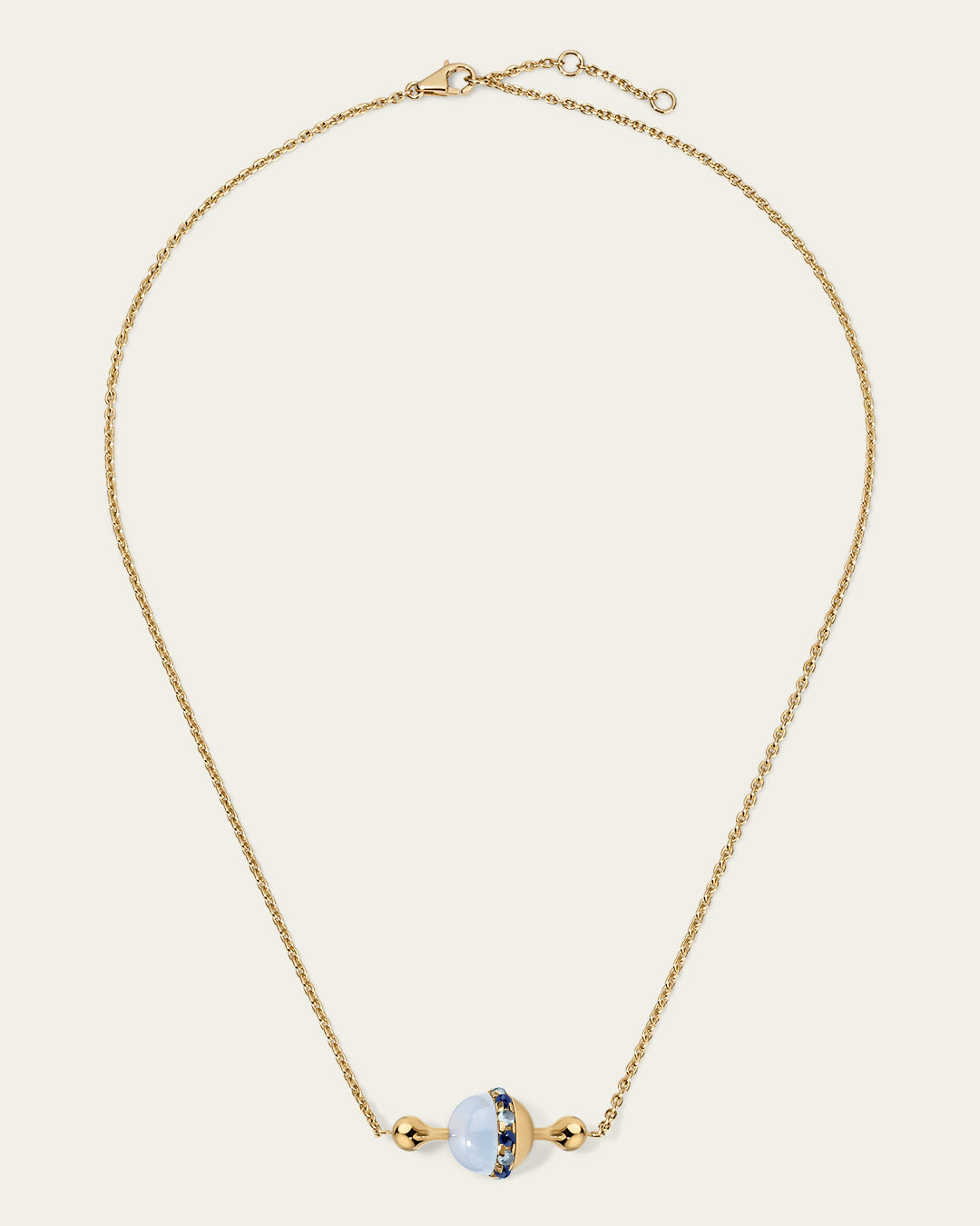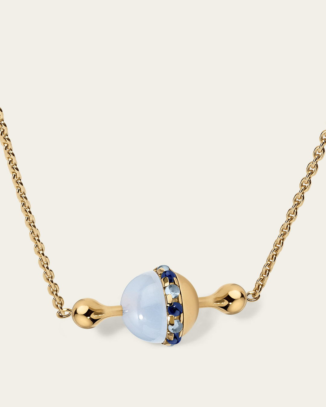 This necklace features an 18K gold bar, adorned with a sliding hemisphere bead of chalcedony and a gold dome. The edges are accented with blue sapphire and spinel cabochons.